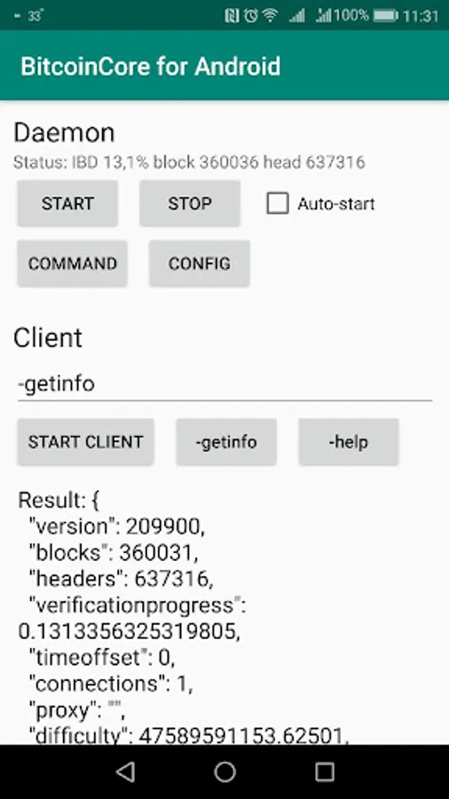 This app includes bitcoind and bitcoin-cli compiled for Android. All command line and config options are available to the user. There is an option to auto-start the daemon when device is charging and on WiFi.