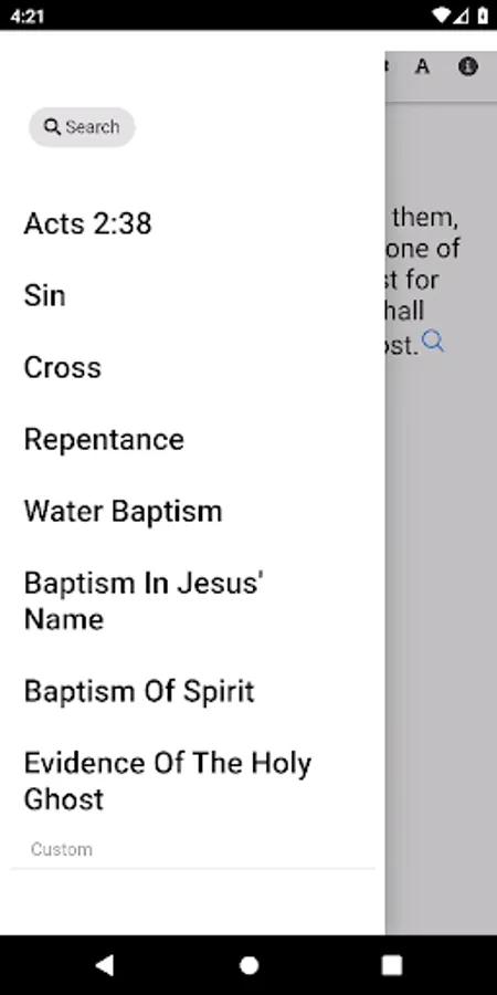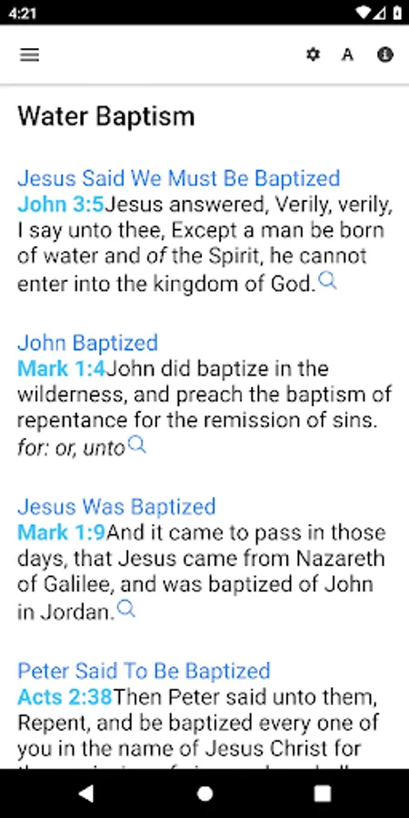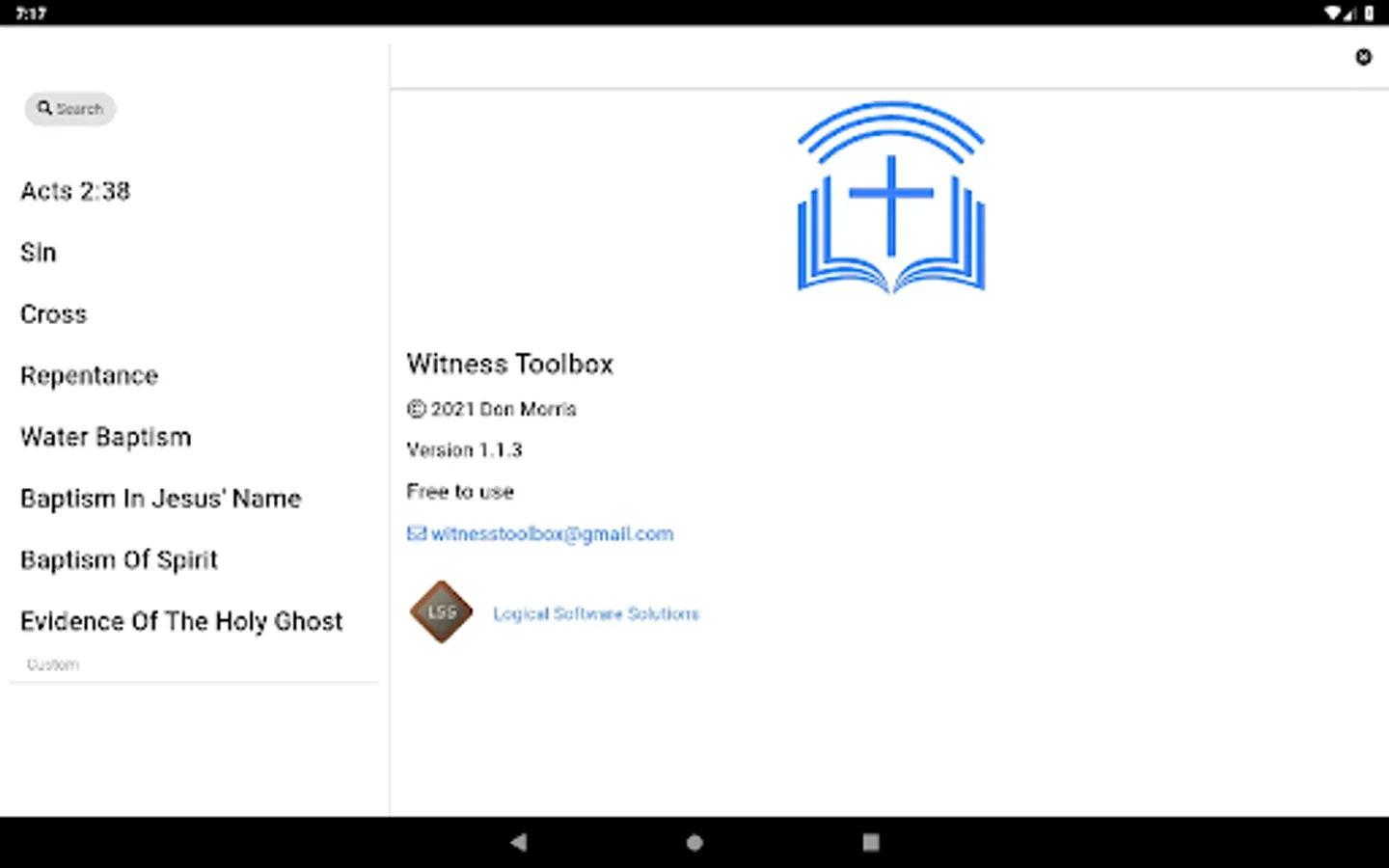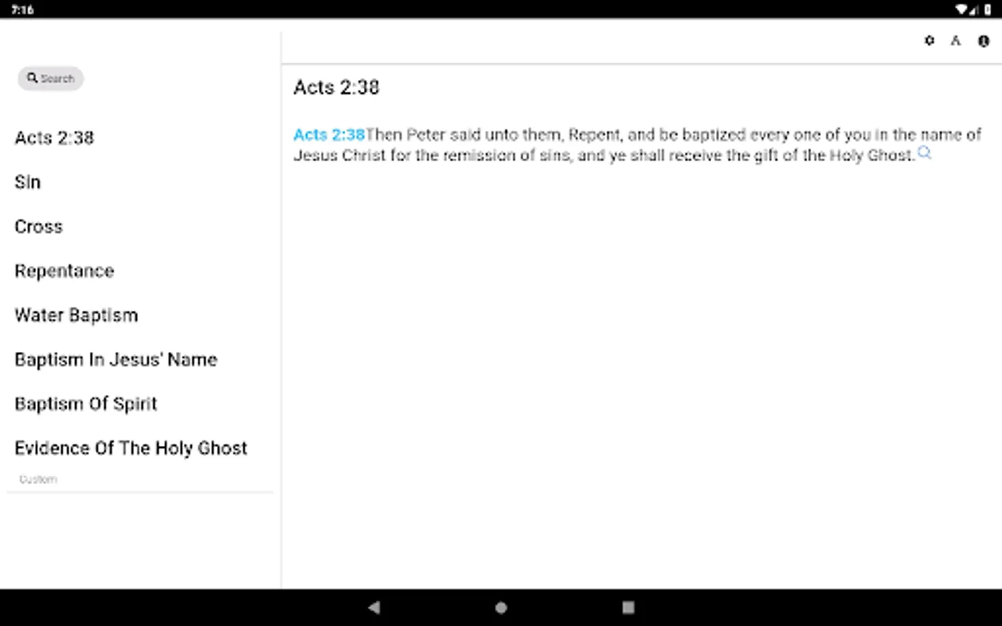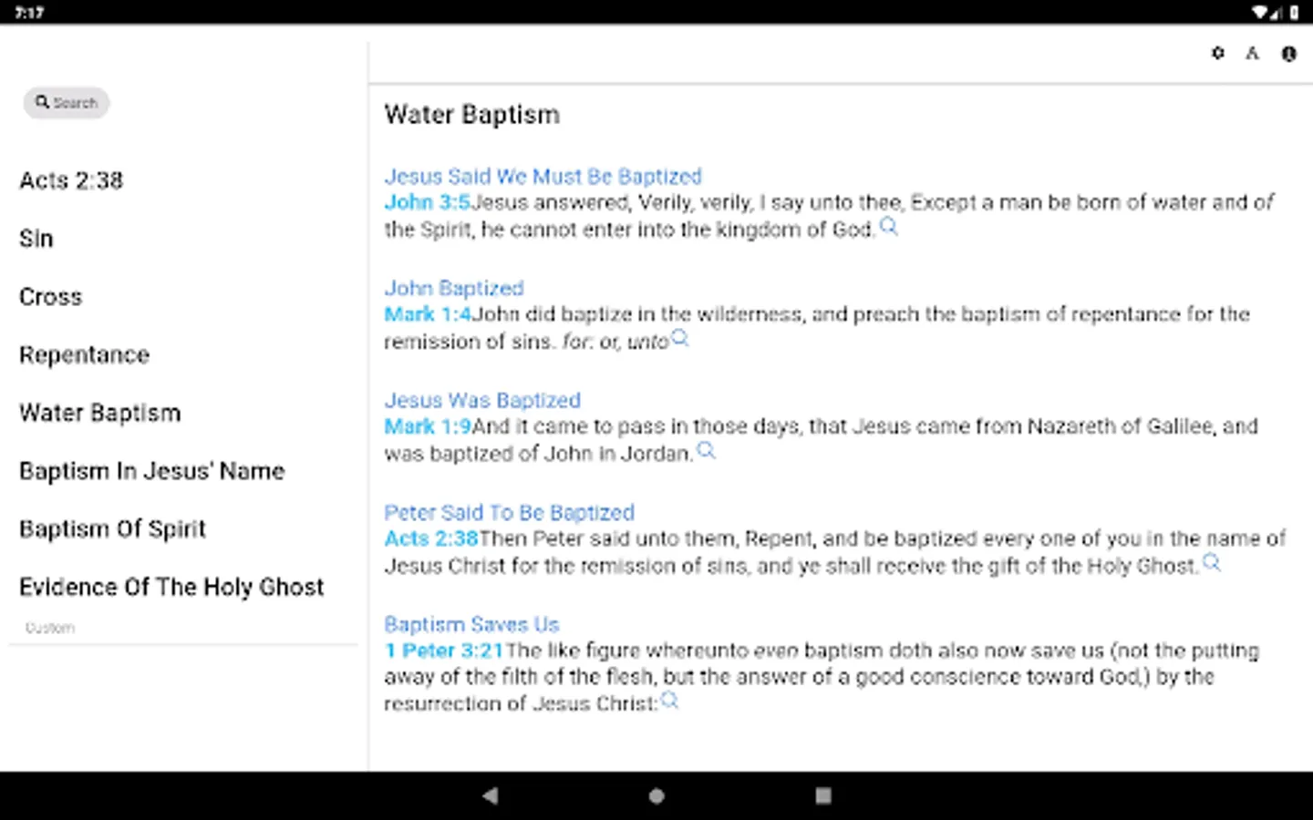 Witness Toolbox provides a topical list that is built upon Apostolic teachings and “The Roman Road”. There are relevant scriptures under each topic. The topic list provides rapid access to scriptures pertaining to God's plan of salvation. For example, you need to share what repentance is, there is a topic with relevant scripture for quick access.