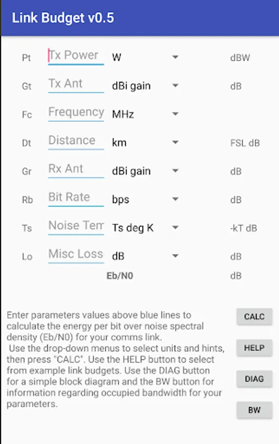 The user enters link parameters such as transmit power, antenna gains, link distance, bit rate etc. This allows the received signal quality to be evaluated. Many link parameters allow different input options. For example the antenna gain may be given in dBi, or the diameter of a dish antenna in meters. This app deals with digital communication links, rather than analog systems.