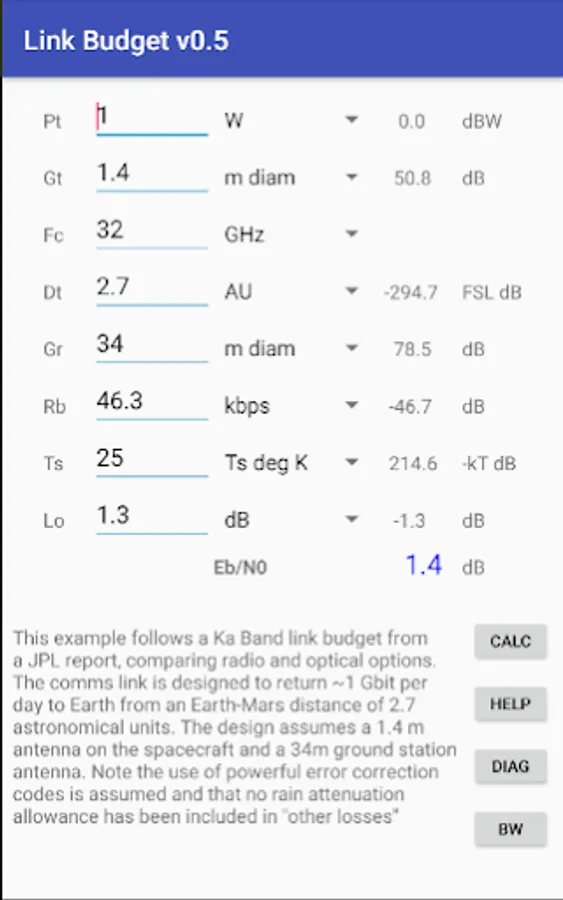 Each of the 8 parameters allows appropriate units to be selected, and provides brief hints. After entering suitable parameters, the user presses the "CALC" button to evaluate the link budget. Numerical values (in dB) that contribute to the final Eb/N0 result are shown in the second screenshot which is one of the examples (Ka Band Mars return link).