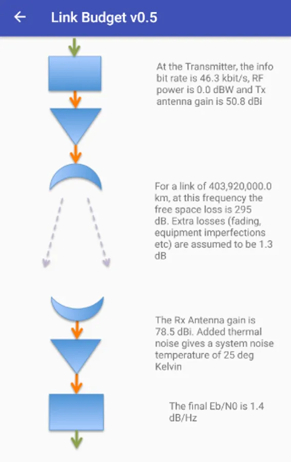 This app includes several on-line examples, for satellite and terrestrial communications, plus brief notes on interesting or novel aspects of these links. Examples range from very short links to space communications. A link is provided to a short tutorial on link budget parameters and the formulas used in the app. The latest version provides information on the bandwidth options, given the Eb/N0.