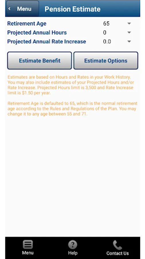 Estimate your current pension benefit, based on your selected Retirement Age and your work history. You can also do a projected estimate, based on input of Projected Annual Hours and Projected Annual Rate Increase.
