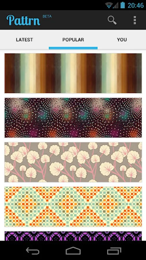Pattrn is an unique wallpaper app for phones and tablets that gives you access to the huge collection of patterns created by the COLOURlovers community.