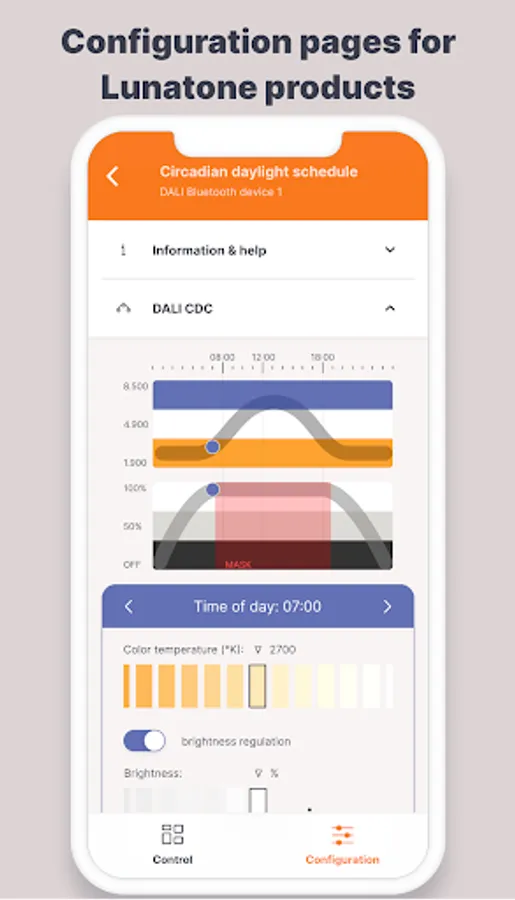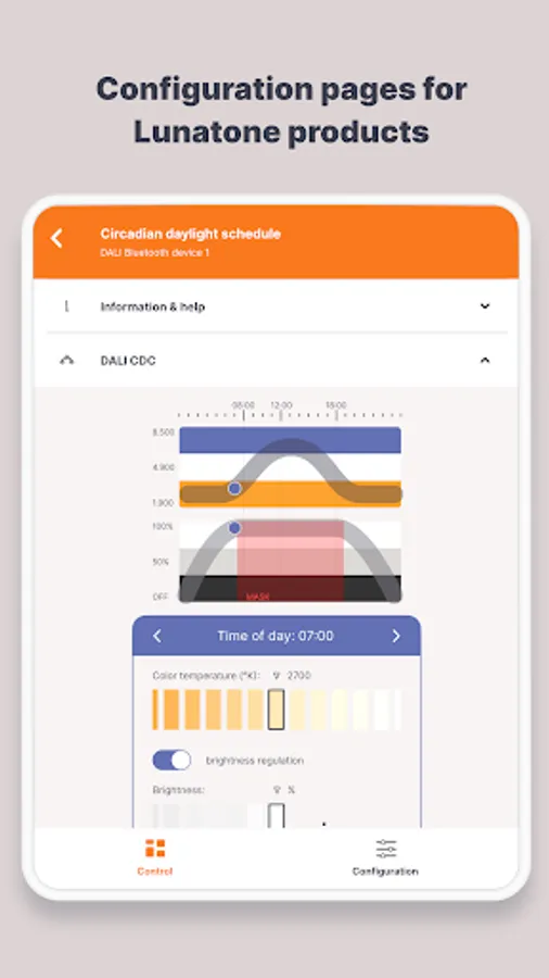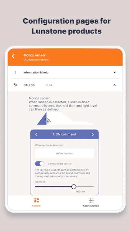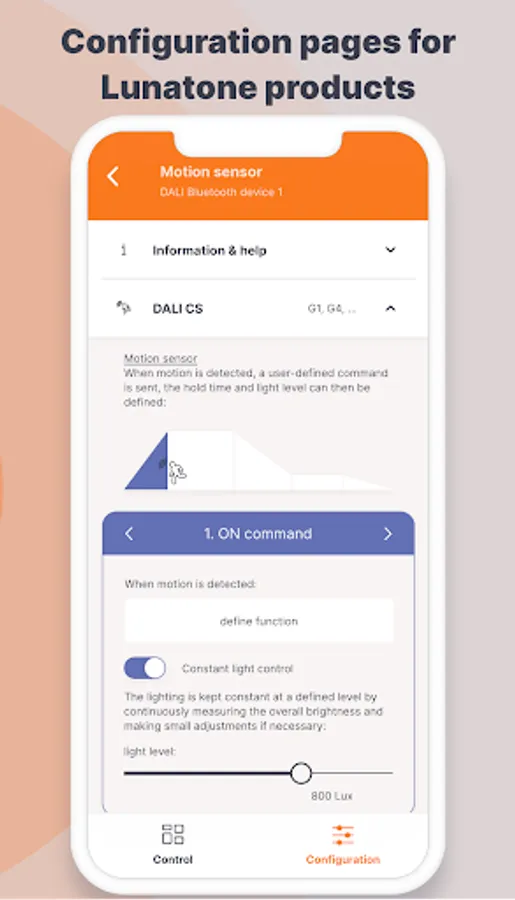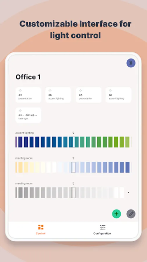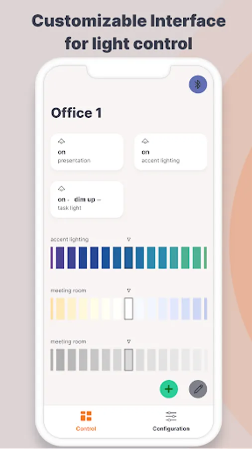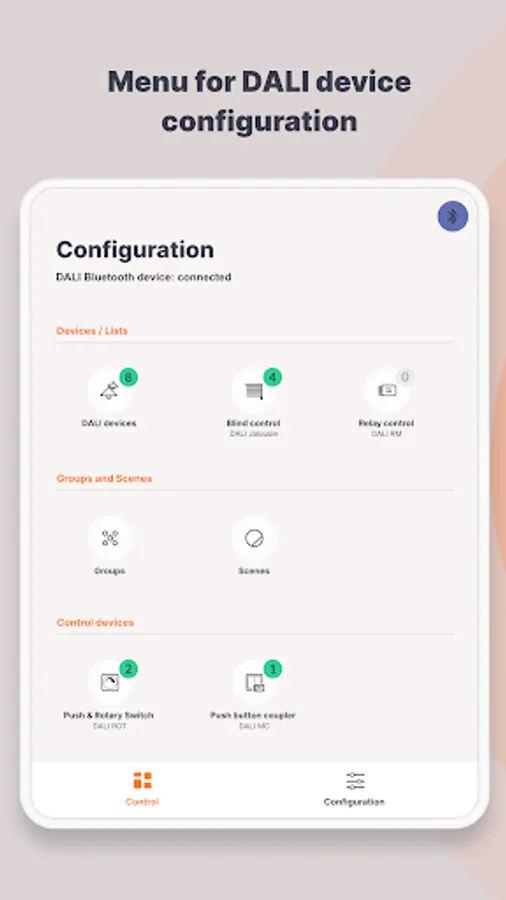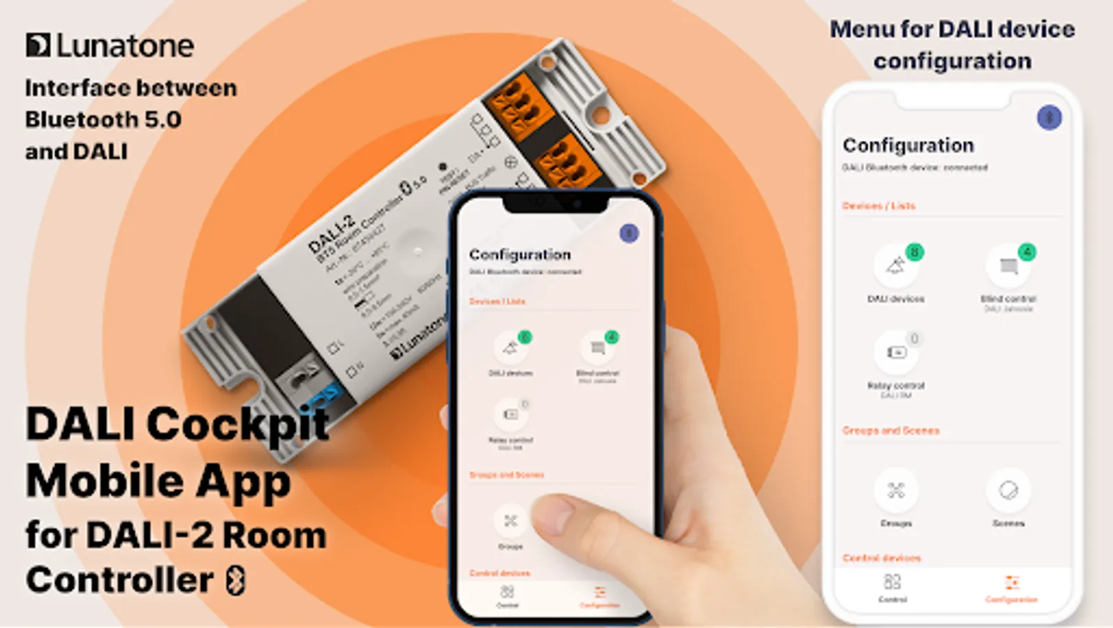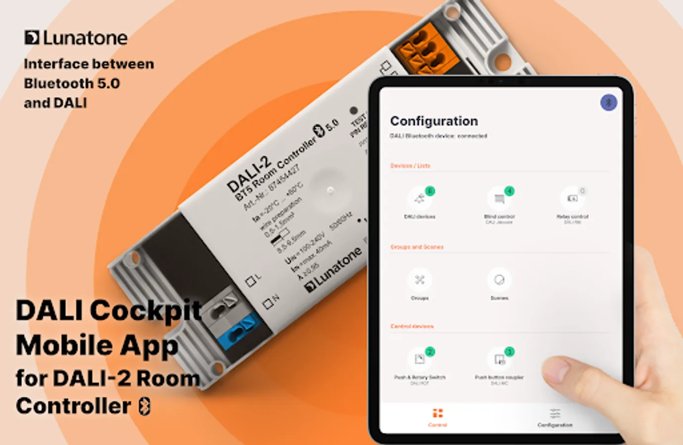 Smartphone application for configuration and control of DALI systems in connection with the DALI-2 BT5 Room Controller.