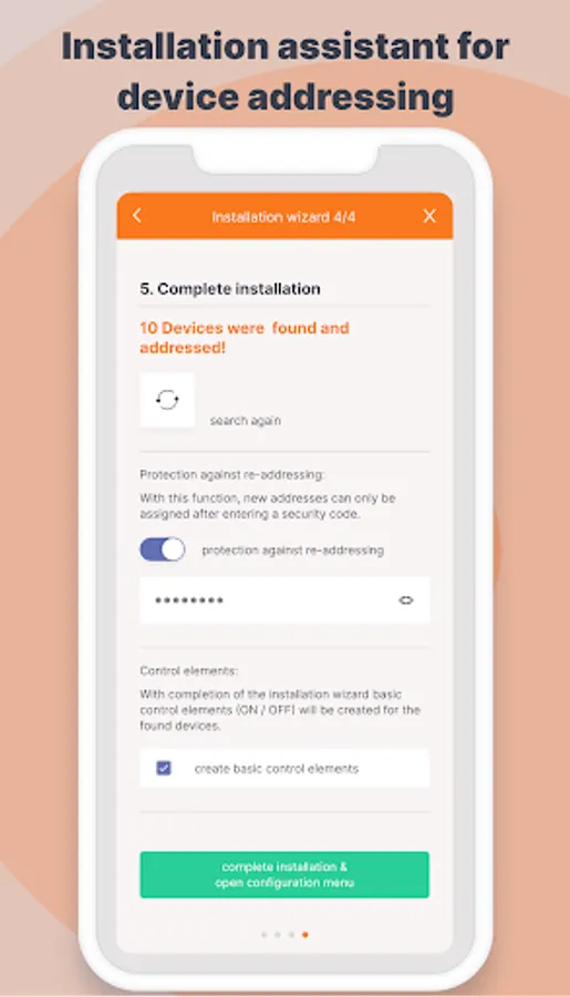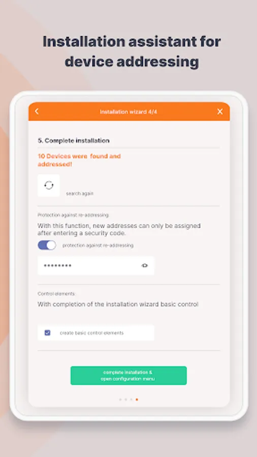 Furthermore a customisable user interface is available to control the connected devices, allowing switching, dimming, colour and scene control.