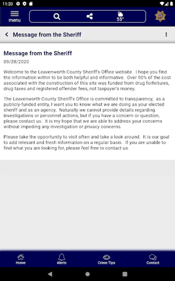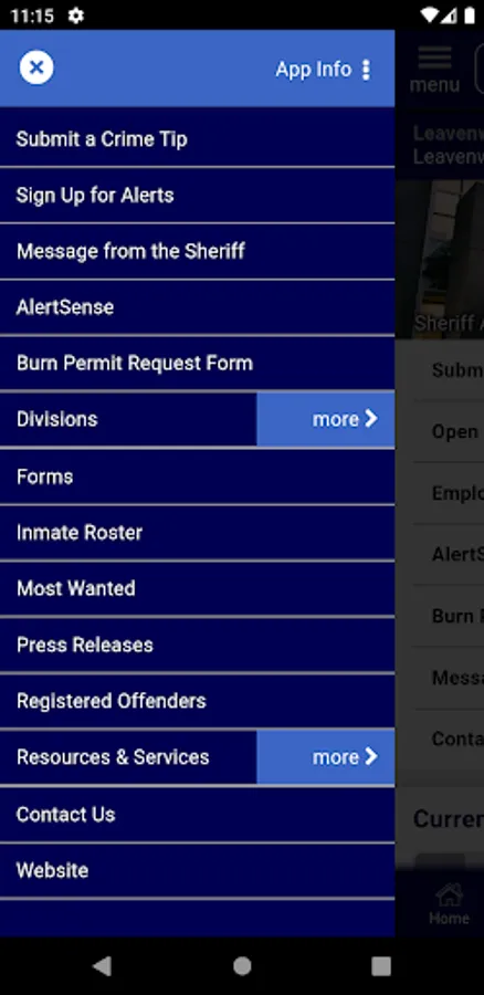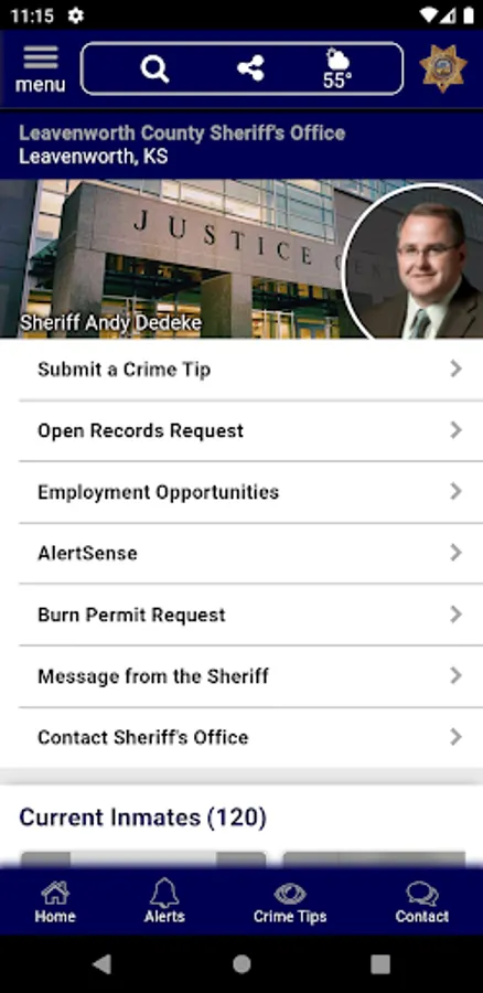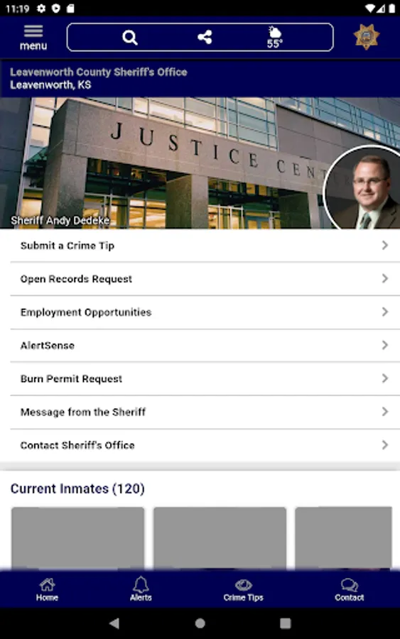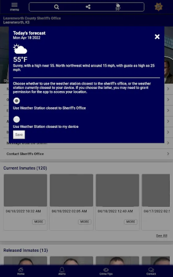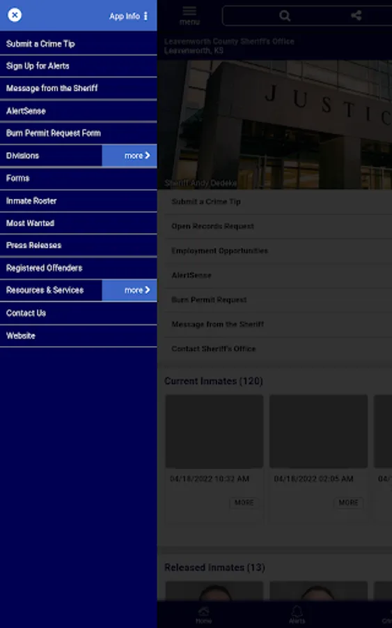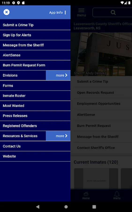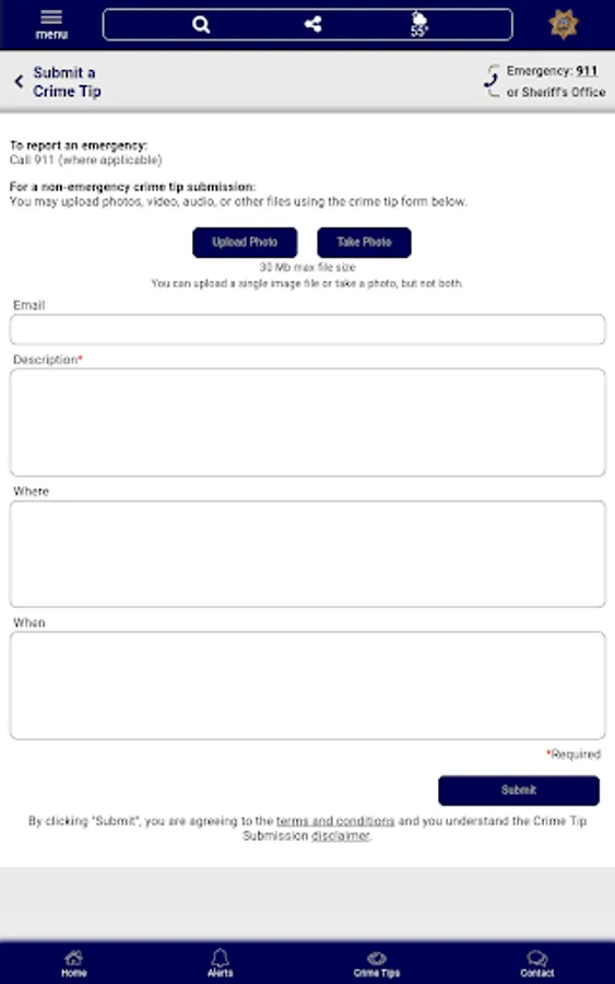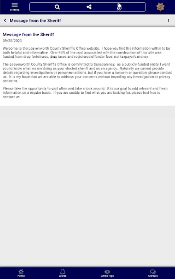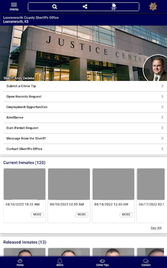 The app has public information for press releases, inmates, most wanted, registered offenders, and special alerts. Crime tips and contact us messages can be sent to the Sheriff's Office.