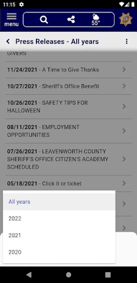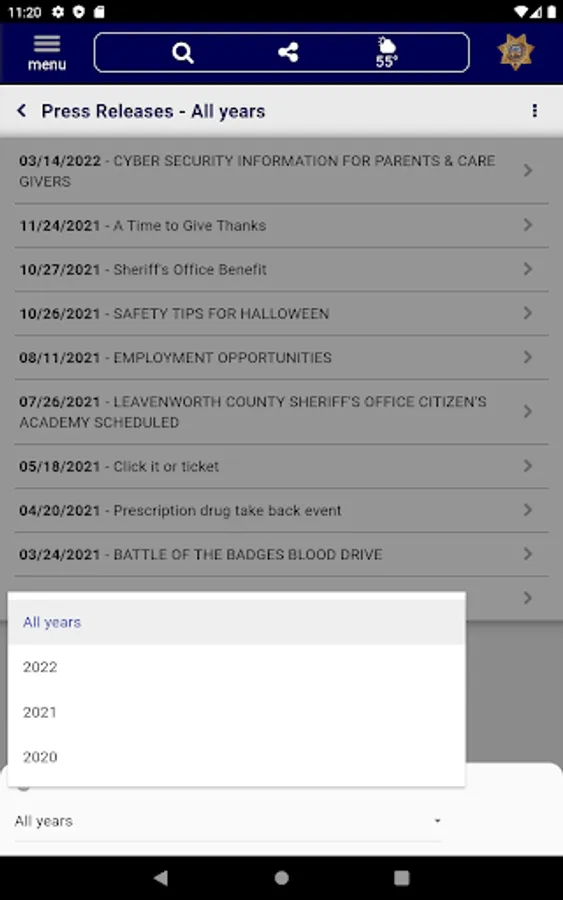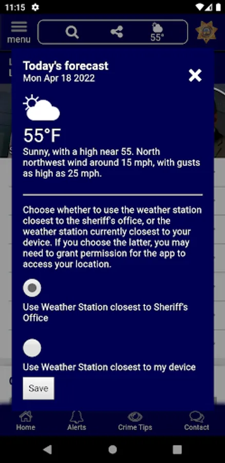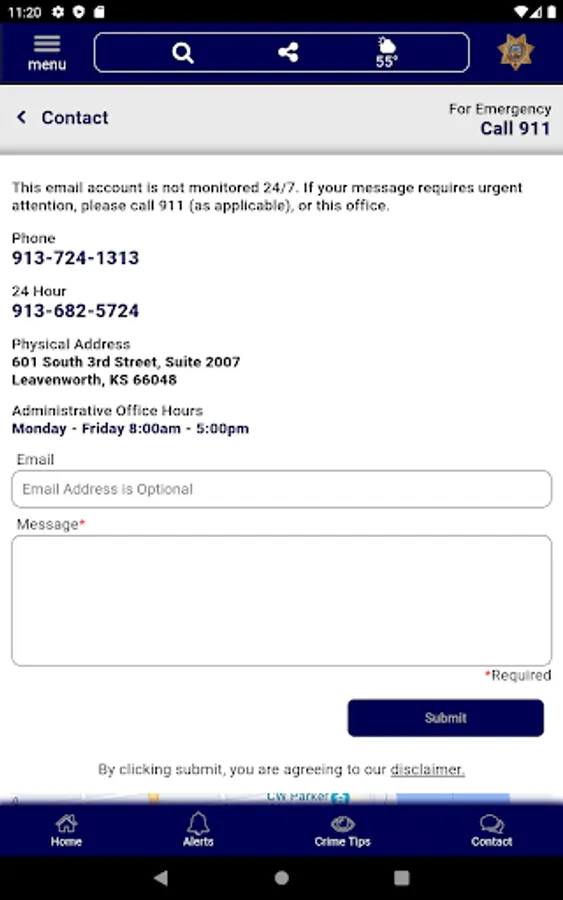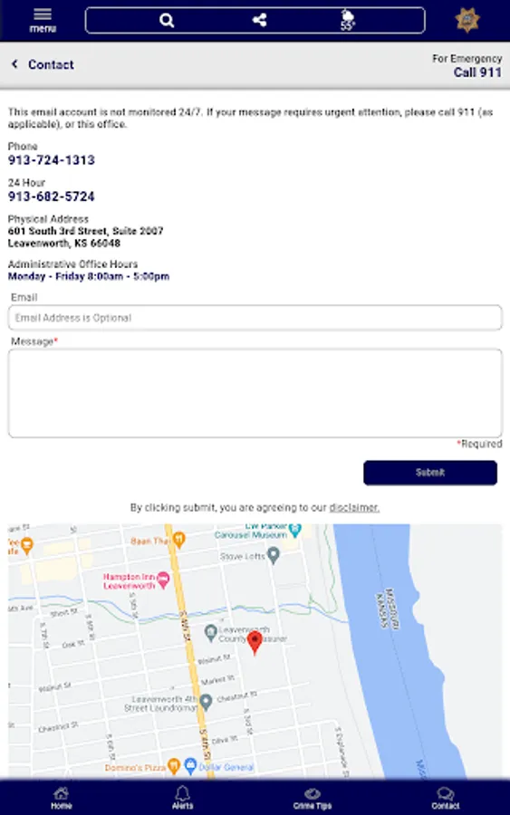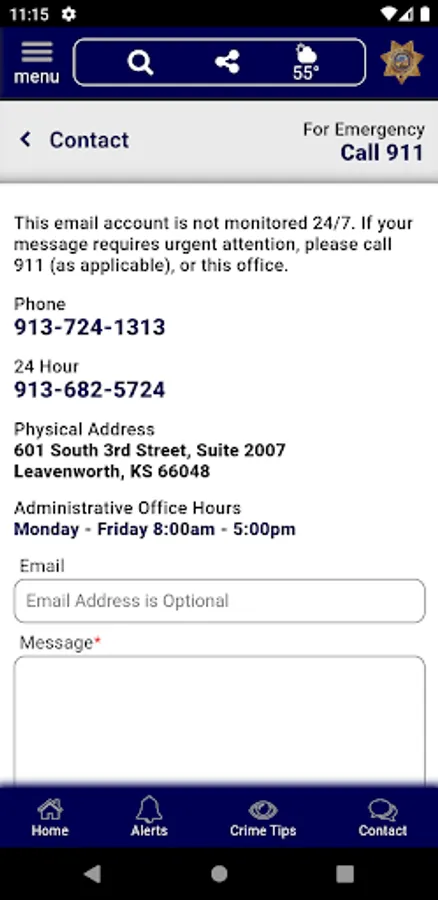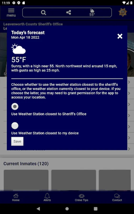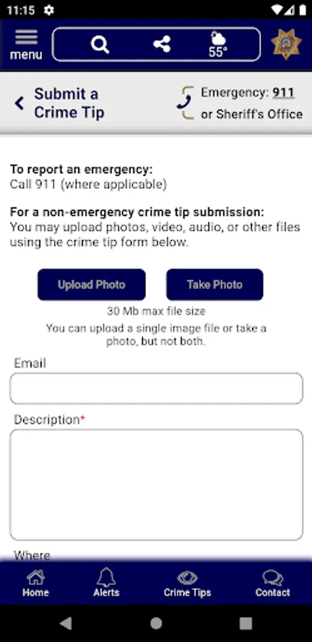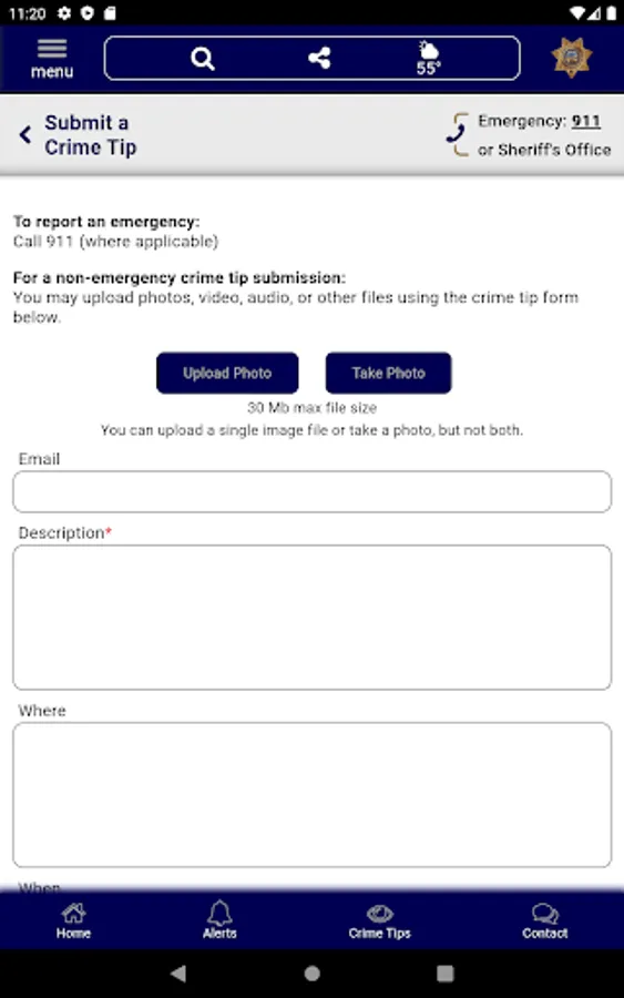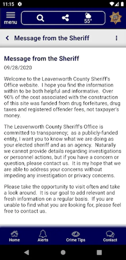 The app has public information for press releases, inmates, most wanted, registered offenders, and special alerts. Crime tips and contact us messages can be sent to the Sheriff's Office.