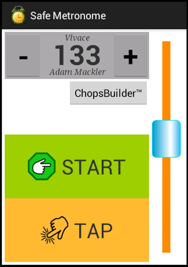 ChopsBuilder™ is based on the scientific principle of "progressive overload." Use ChopsBuilder™, and while you practice, the tempo gradually increases until you reach your desired speed. This secret trick has been used for generations by virtuoso musicians to develop their ability to shred the most difficult passages and make it look easy. ChopsBuilder™ is brought to you now for the first time ever in an Android app, exclusively in Safe Metronome.