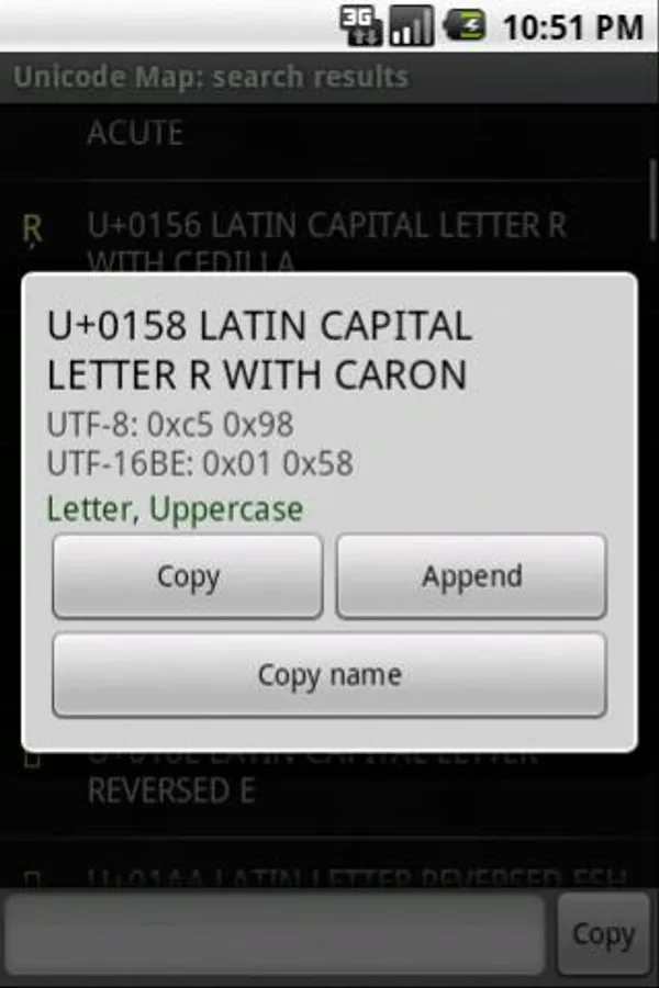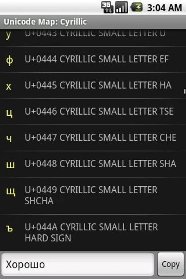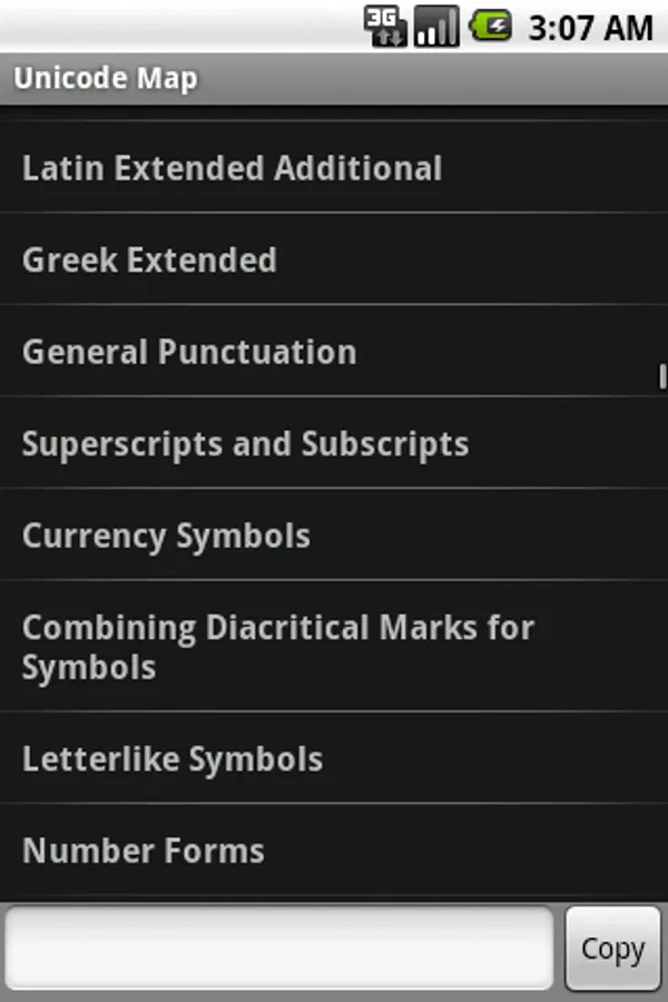 Lets you browse Unicode characters by range and search for them by name, display them (when Android has the font) and copy them to the clipboard. It can also decode a string of Unicode characters to names.