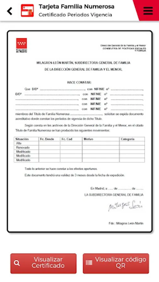 This APP allows storing large family and individual card in the mobile phone with the same validity as the current physical cards. It also offers additional services such as notifications, news of interest, download the certificate validity periods title and information from the states of processing an application.
