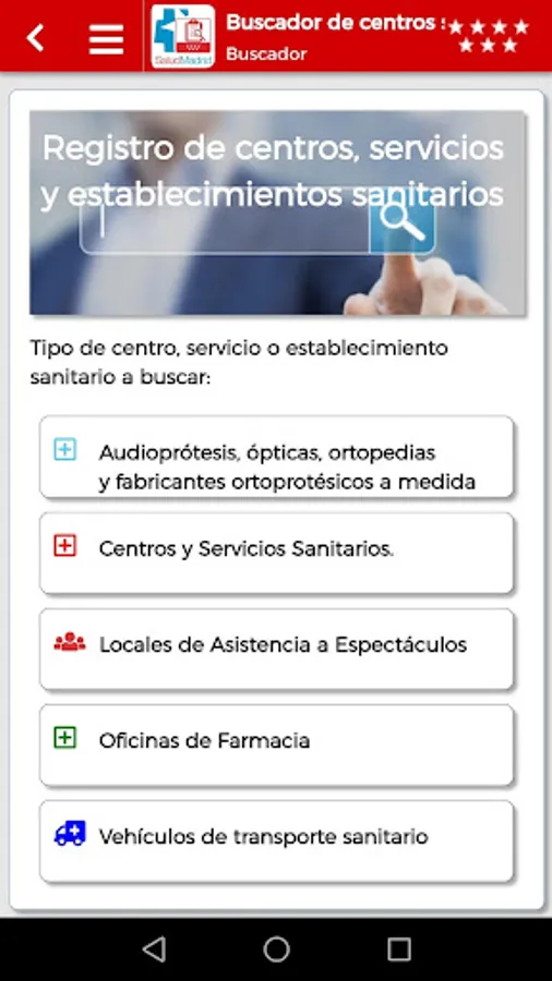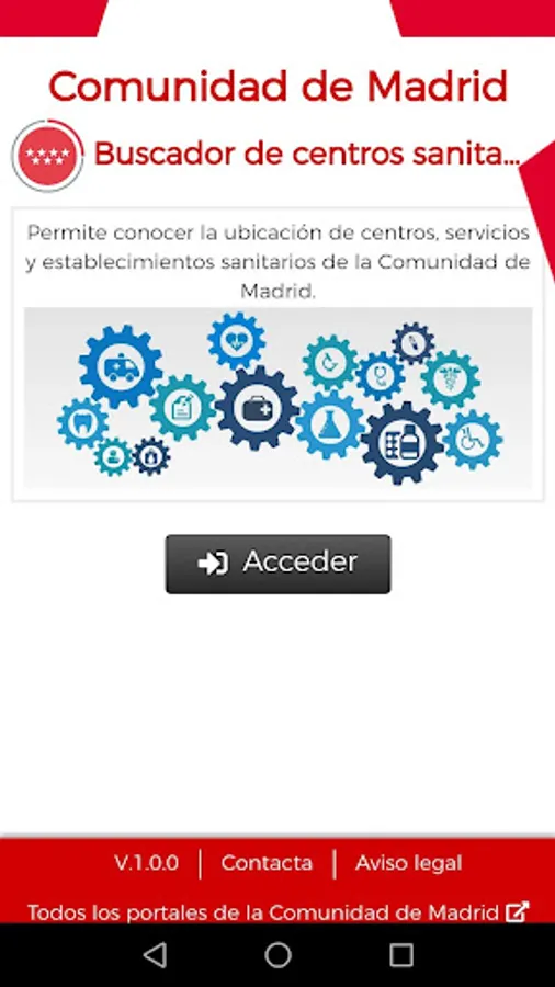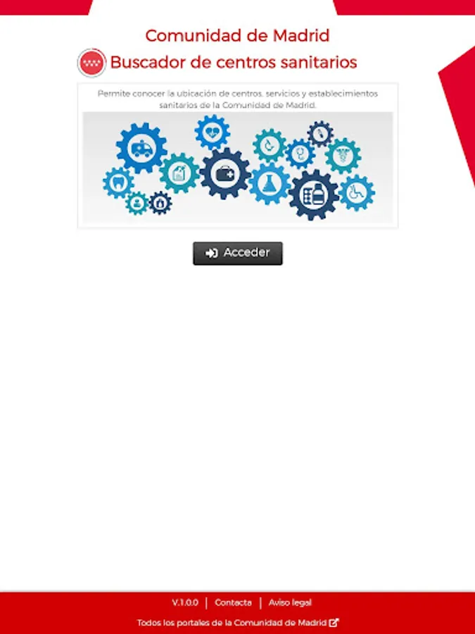 This app allows to know the location of the centers, services and health and pharmaceutical establishments, their offer and their registration in terms of authorization and accreditation of the public and private health system of the Community of Madrid, as a guarantee of compliance with regulations current that is applicable.
