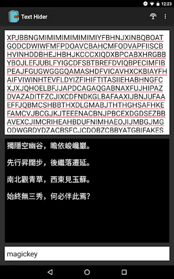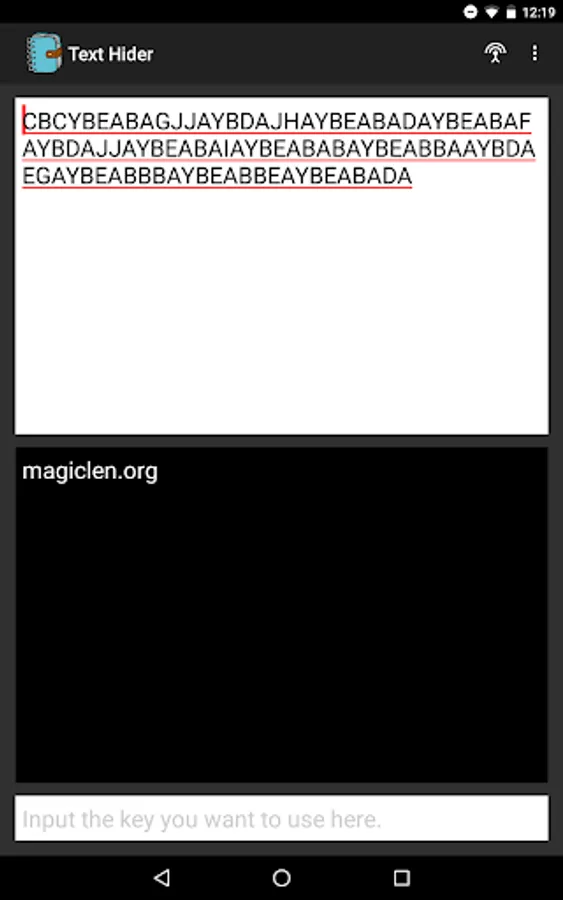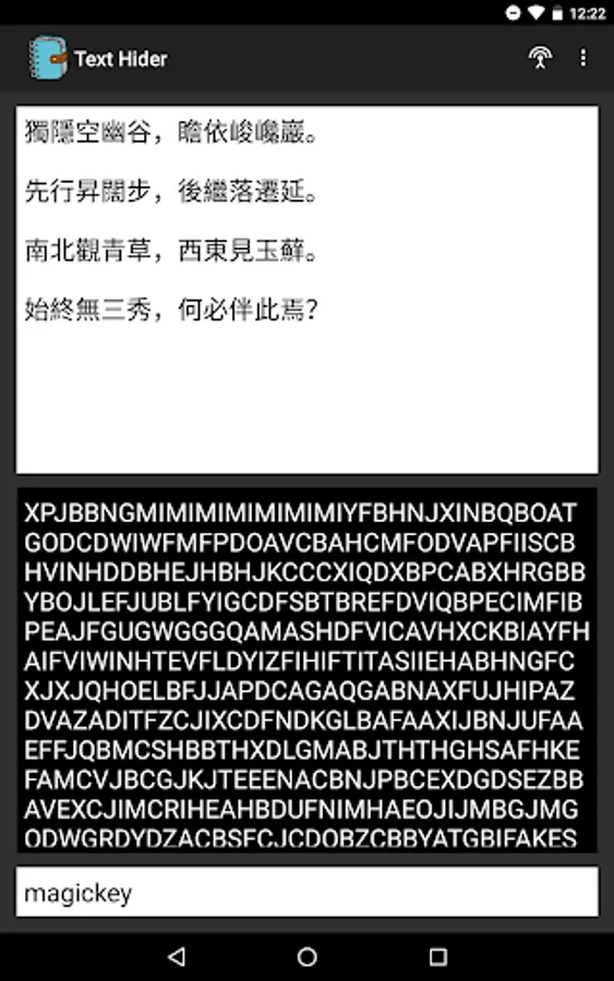 This application uses MagicStringHider library to hide/unhide any text. You can also add an optional key to protect your text.