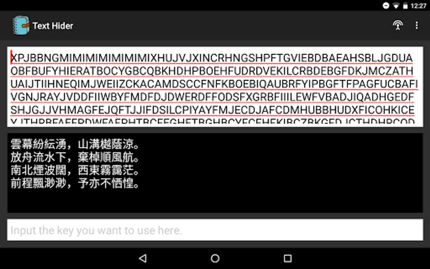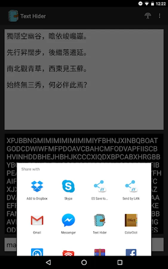 If you want to send some sensitive or private messages to someone via the Internet(Maybe some social networking sites, such as Facebook, Skype and Line.), you must ensure your messages will not be leaked. So, you need this application to hide your messages and send the hidden messages out.