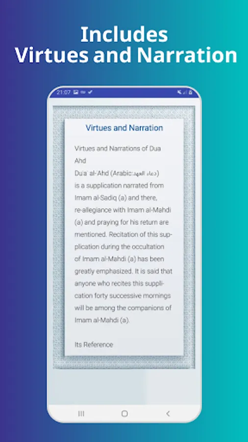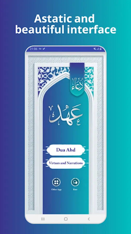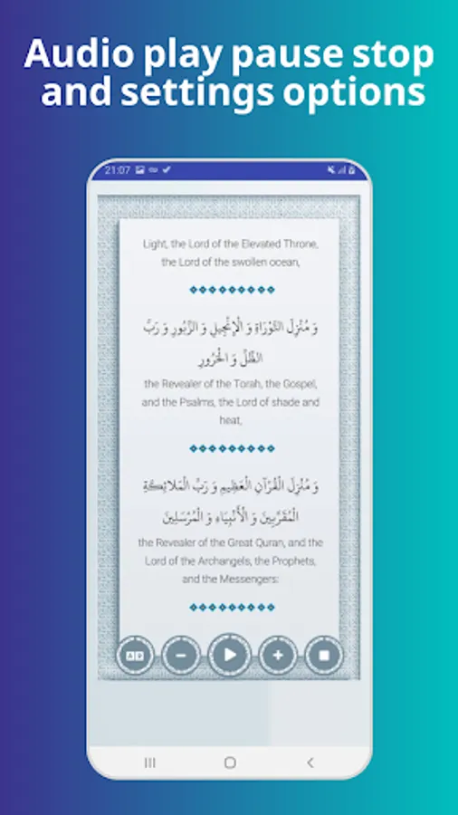 Application Features: Astatic and beautiful interface, Audio play, pause, stop and settings options, English translation of the supplication, Changing font size option, Language option (English), Beautiful recitation, Text is highlighted as it is being read, Completely offline, No Internet, Virtues and Narrations of Dua.