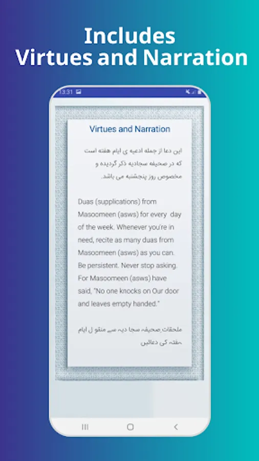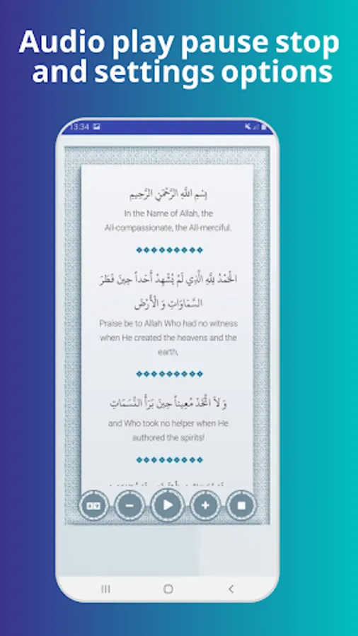 Application Features: Astatic and beautiful interface, Audio play, pause, stop and settings options -English translation of the supplication, Changing font size option, Language option (English), Beautiful recitation, Text is highlighted as it is being read, Completely offline, No Internet.