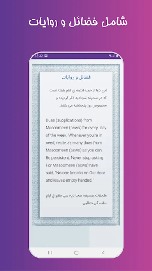 Thursday prayer of Imam Sajjad (AS) in Sahifeh Sajadiyyah book with fluent Persian translation and translation and beautiful graphical interface and the possibility of automatic scrolling and text zoom.