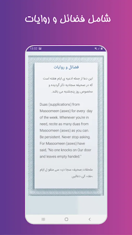 Saturday prayer of Imam Sajjad (AS) in Sahifeh Sajadiyyah book with fluent Persian translation and translation and beautiful graphical interface and the possibility of auto scrolling with text zoom.