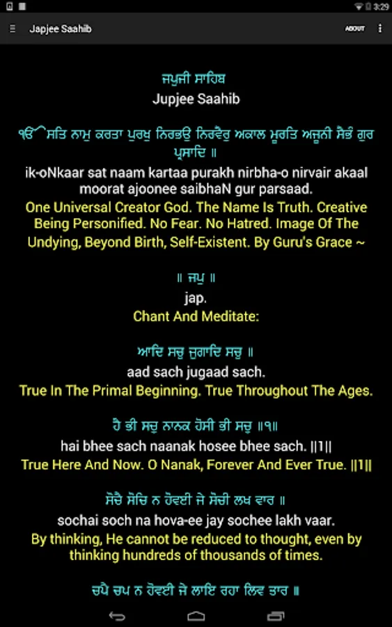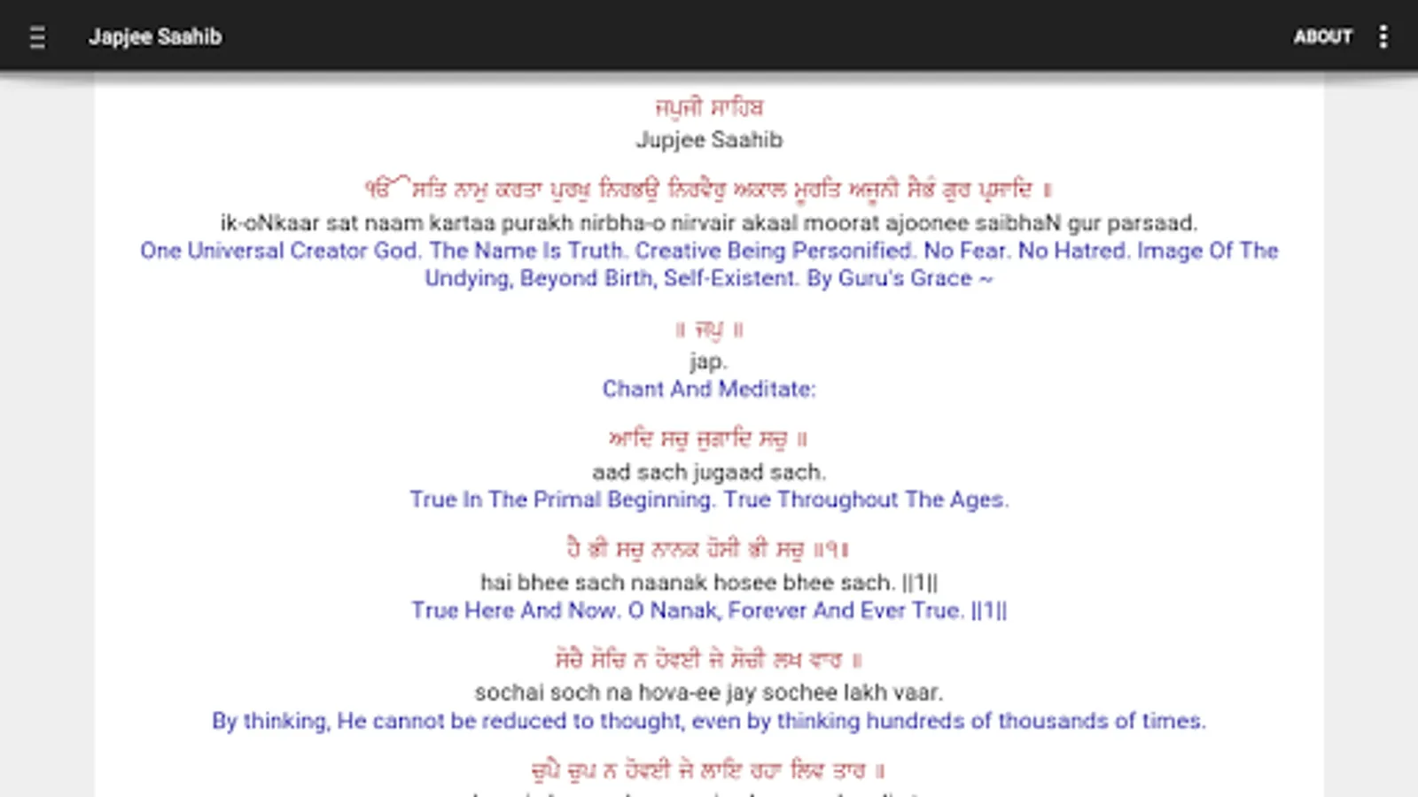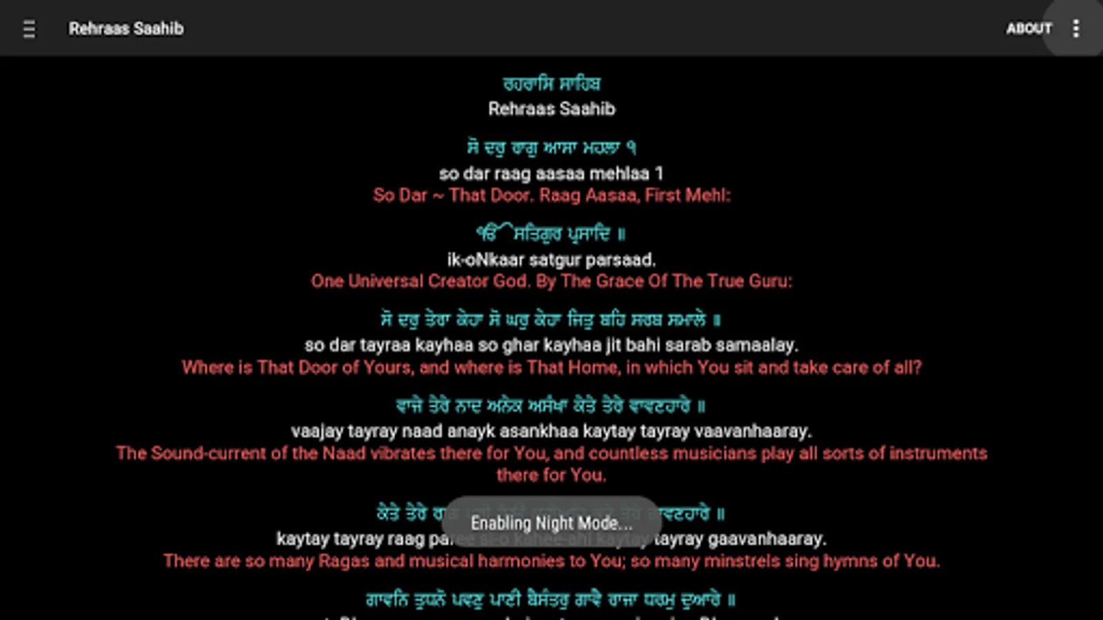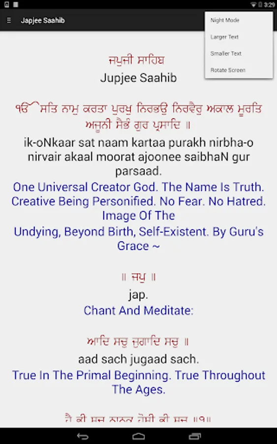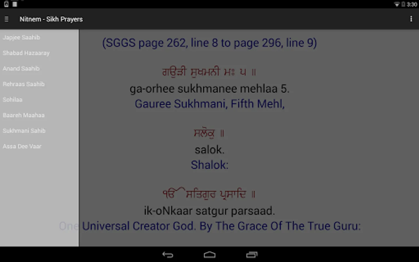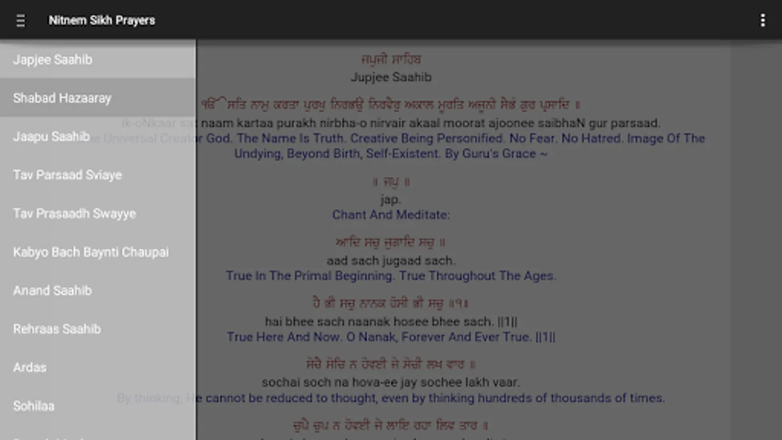 This is a simple, ad-free easy to use application that provides you with Nitnem Sikh Prayers in Gurmukhi (Punjabi), Romanized (Transliteration) and Translation texts. It locks the screen into portrat mode but you can choose to rotate it using the menu. The menu also lets you toggle night reading mode (black background that emits less light) and increase / decrease text size.