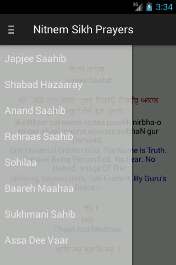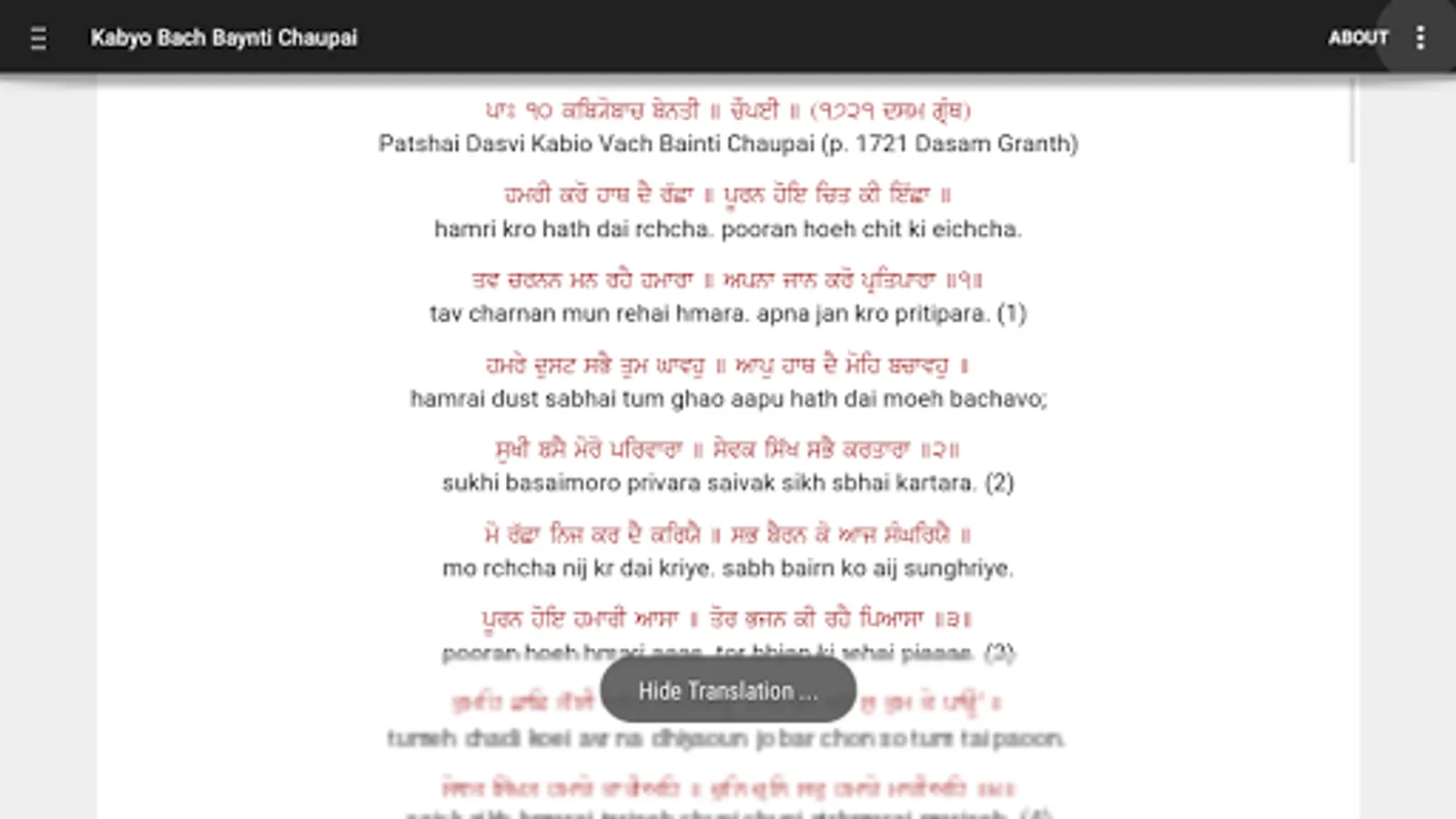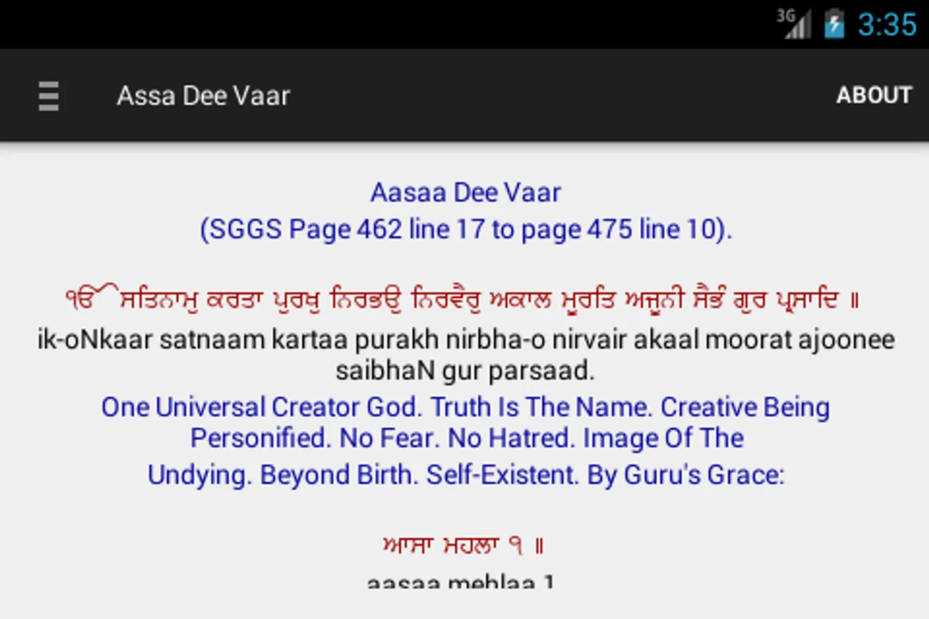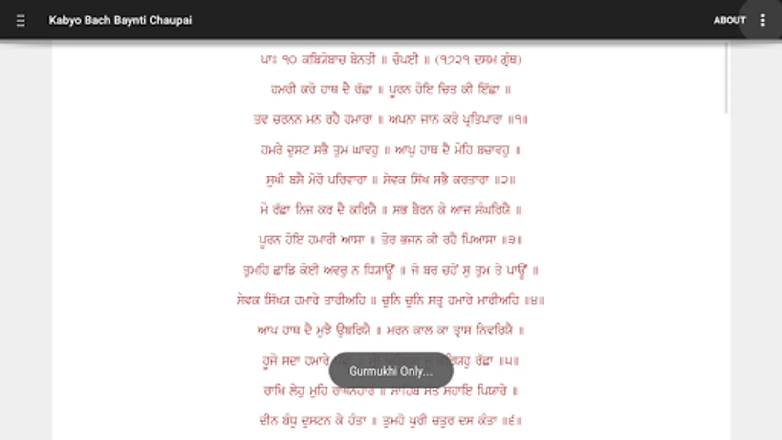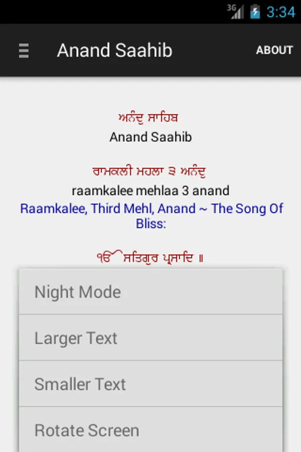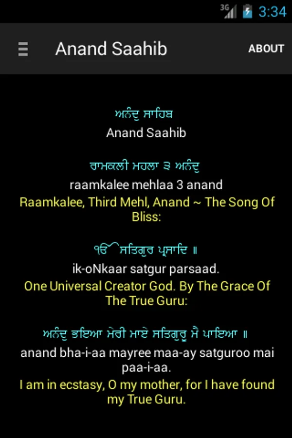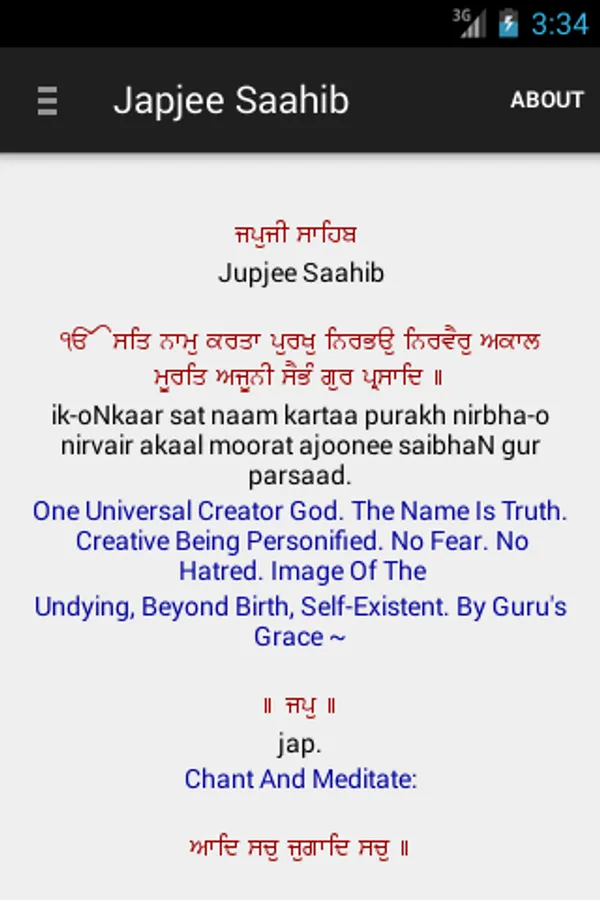 This is a simple, ad-free easy to use application that provides you with Nitnem Sikh Prayers in Gurmukhi (Punjabi), Romanized (Transliteration) and Translation texts. It locks the screen into portrat mode but you can choose to rotate it using the menu. The menu also lets you toggle night reading mode (black background that emits less light) and increase / decrease text size.