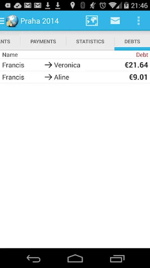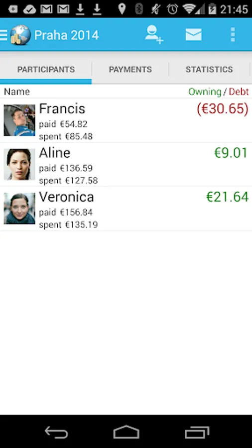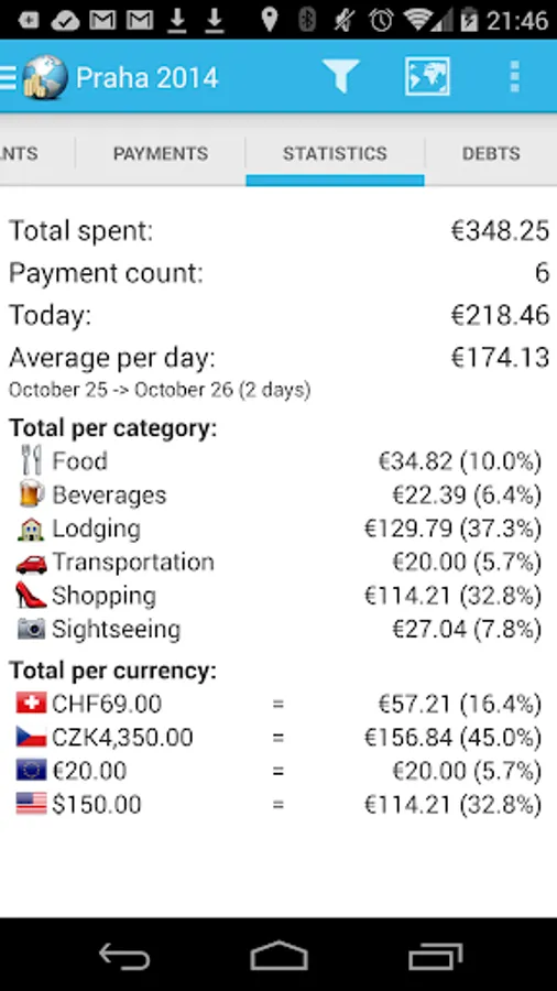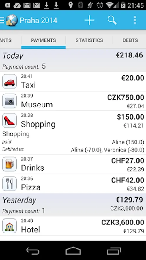 It tells you how much each person owns or owes other people in the group. It supports exchange rate conversion on the fly, online sharing and detailed statistics.