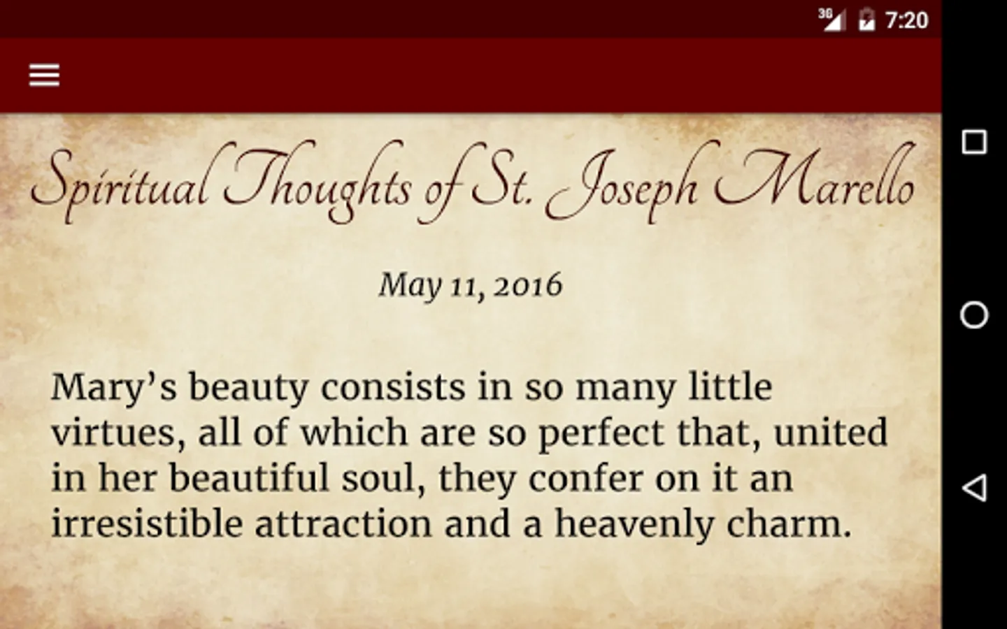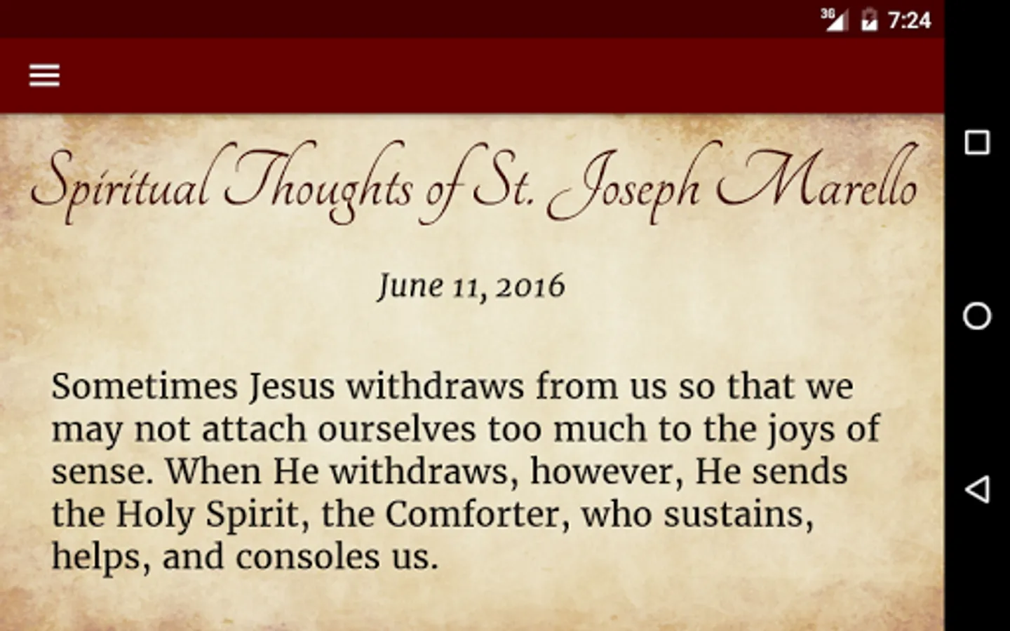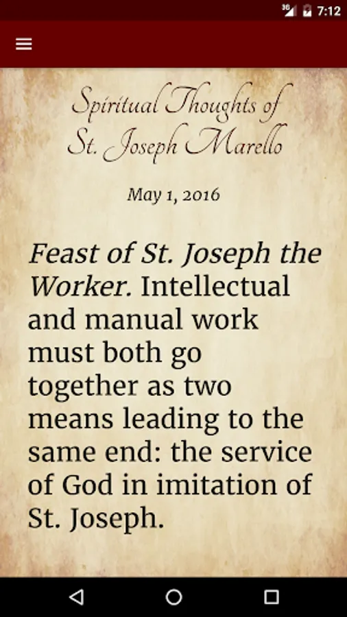 Be inspired by daily reflections and spiritual thoughts from St. Joseph Marello, bishop and founder of the religious congregation of the Oblates of St. Joseph. This simple app provides a quote from St. Joseph Marello for every day of the year, complementing the liturgical cycle of the Catholic Church, and helping you to grow in your faith and love of Jesus and his Church! Also included are prayers to/by St. Joseph Marello, and some biographical information about this holy Saint.