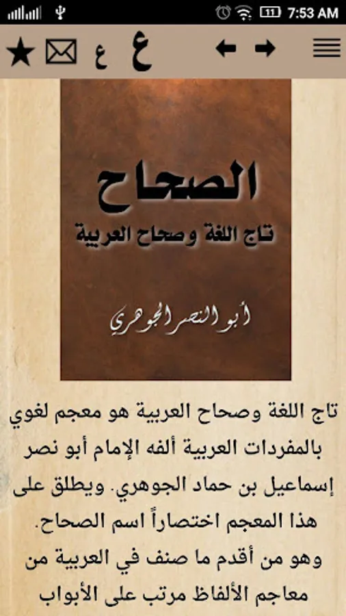 It is one of the oldest in the class Arabic words from dictionaries salary on the doors and chapters, Making alphabet doors and make each character of these doors the number of chapters letters of the alphabet. The order of the words in this dictionary words by the end of what was etcetera Nun, for example, find it in the door Noon. The book has been printed in six parts it has been achieved by Mr. Ahmed Abdul Ghafur al-Attar in 1956 in Egypt. This dictionary has included 40 thousand items.