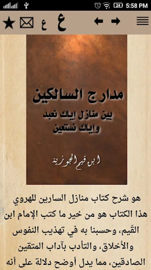 This book is the best of what Imam Ibn Qayyim wrote, Suffice it to refine souls and ethics, politeness ethics pious truthful, demonstrating a clearer indication of it was those converts truthful, who Tabt them to fear God, came the book to fill the urgent need to in the era of art. brings him to this physical activity when people, purity of life, and strengthens the soul, and the refinement of manners, even God makes of the Arabs and Muslims, while gave them of the physical causes of wealth and affluence present and expected in the future, dear life dignified, safe under Islam. Imam Ibn al-Qayyim in this book warns that Kamal human but it is a science useful, and good deeds, namely the guidance and the religion of truth, and Petkmih to others in these two things and recommending the right and patience, and the right only of faith and work, not only the popularity on the Koran and understandable and manageable and extract treasures and its effects, it is the sponsor's interests slaves, pension and recycled, and Mosul them to the way of righteousness.