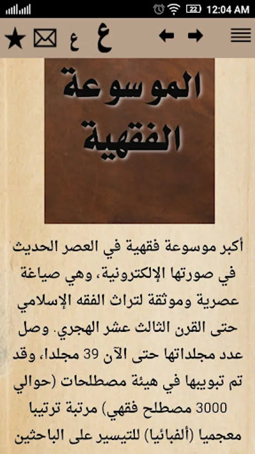 Doctrinal largest encyclopedia in the modern era in the electronic image, a modern and documented the drafting of the heritage of Islamic jurisprudence until the thirteenth century. The number of folders in it so far 39 volumes, has been compiled in the form of terms (about 3000 jurisprudential term) arranged Magamaa AZ to facilitate researchers and students of forensic science. Also it has been added 200,000 referral from the text of the encyclopedia references to various Fiqh