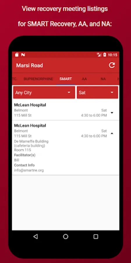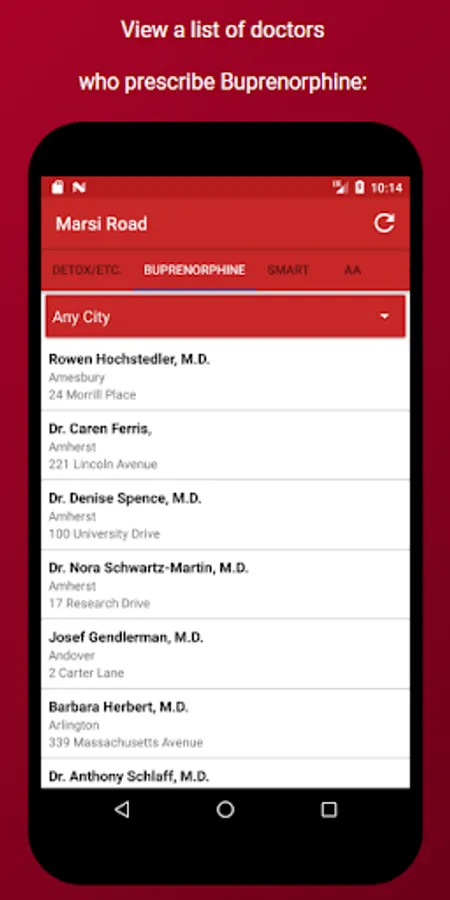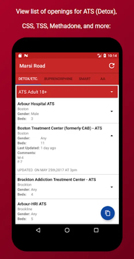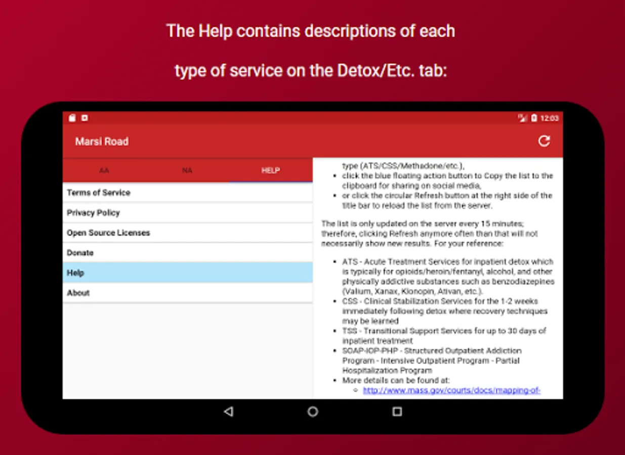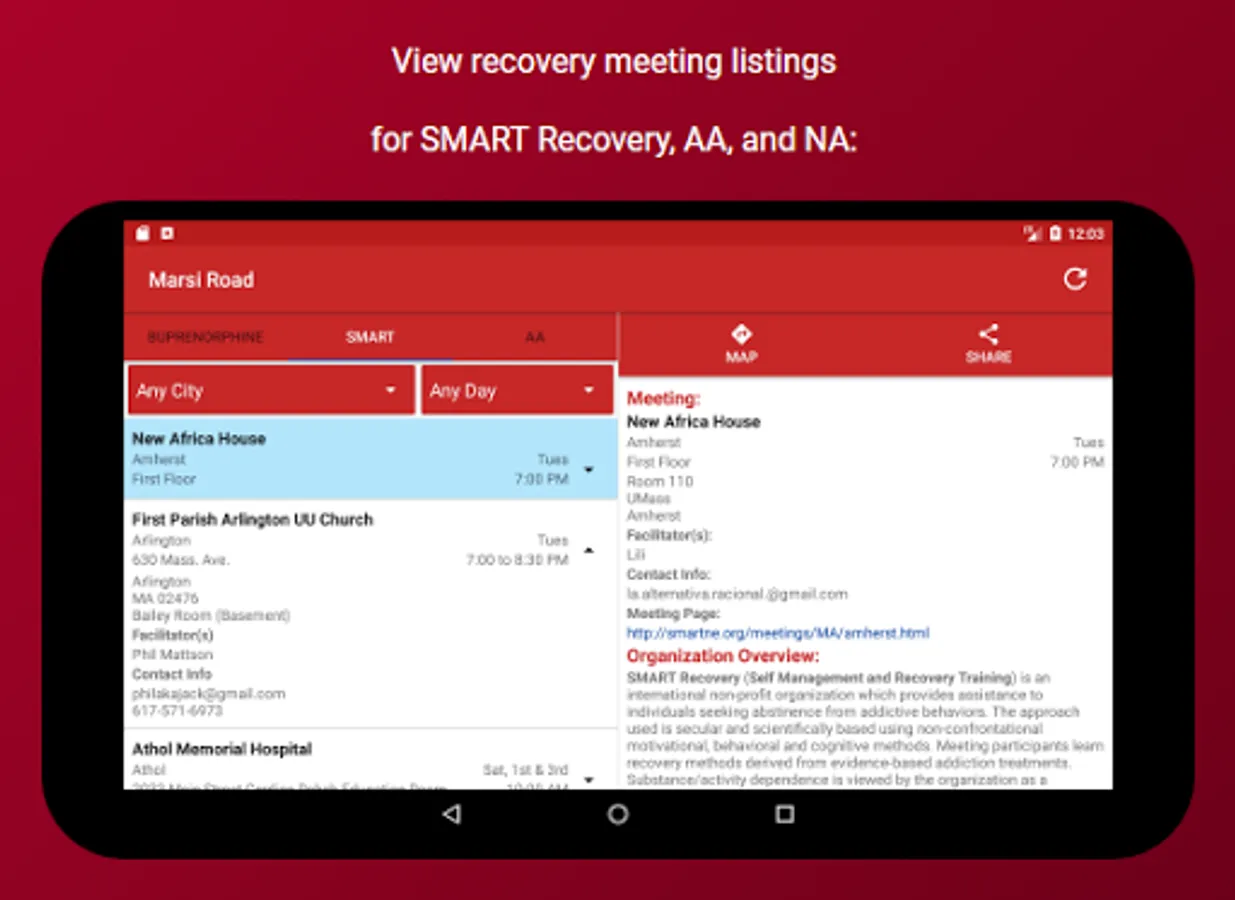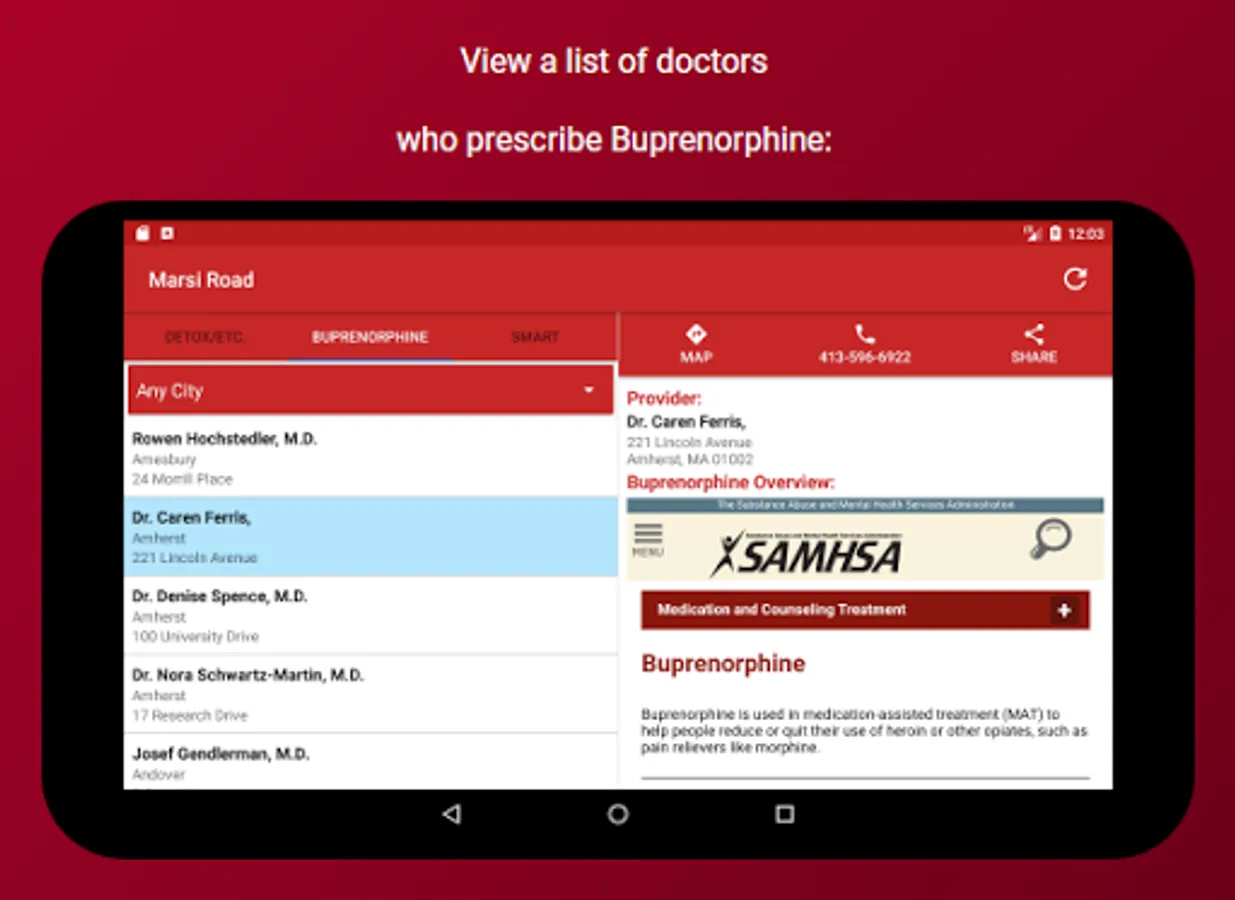 Marsi Road displays a listing of open detox/recovery beds for those dependent on opioids, alcohol, and other drugs that produce physical dependence such as benzodiazepines (xanax, valium, klonopin, ativan, etc.). Also listed are doctors within the state that are licensed to prescribe Buprenorphine, as well as various recovery meetings across the state (SMART Recovery, NA, and AA). All listings are filterable.