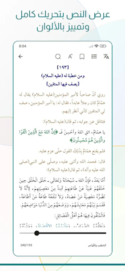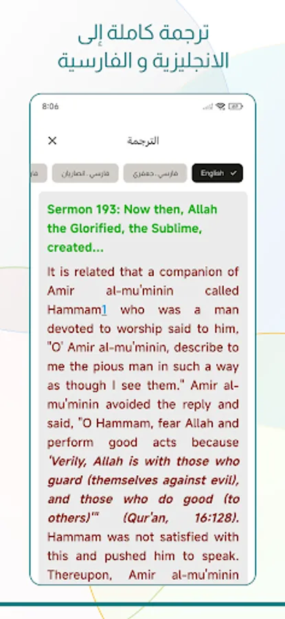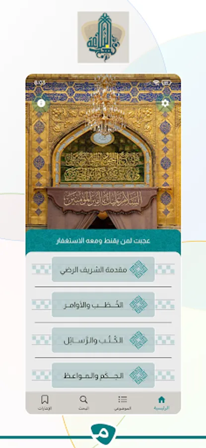 The application before you includes the immortal and unique work (Nahj al-Balagha), a book that brings together a significant portion of the words of the Commander of the Faithful (peace be upon him). This important work was compiled by the towering figure and eminent scholar, Sayyid Sharif Muhammad ibn al-Husayn al-Radi (may God be pleased with him).
