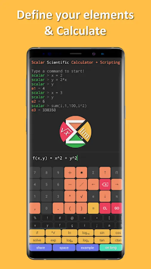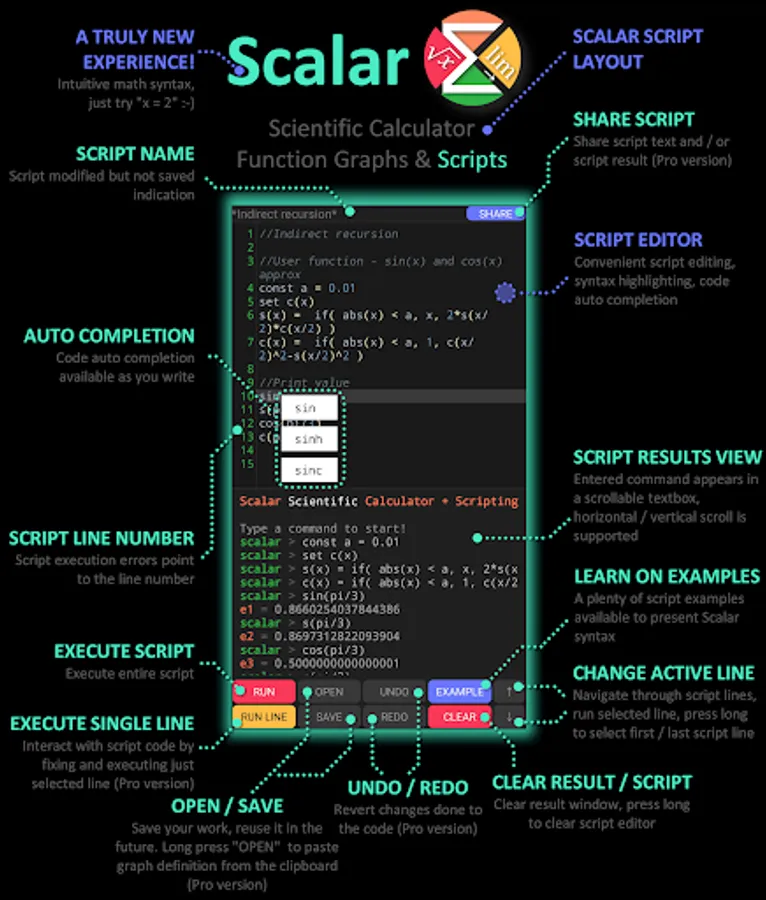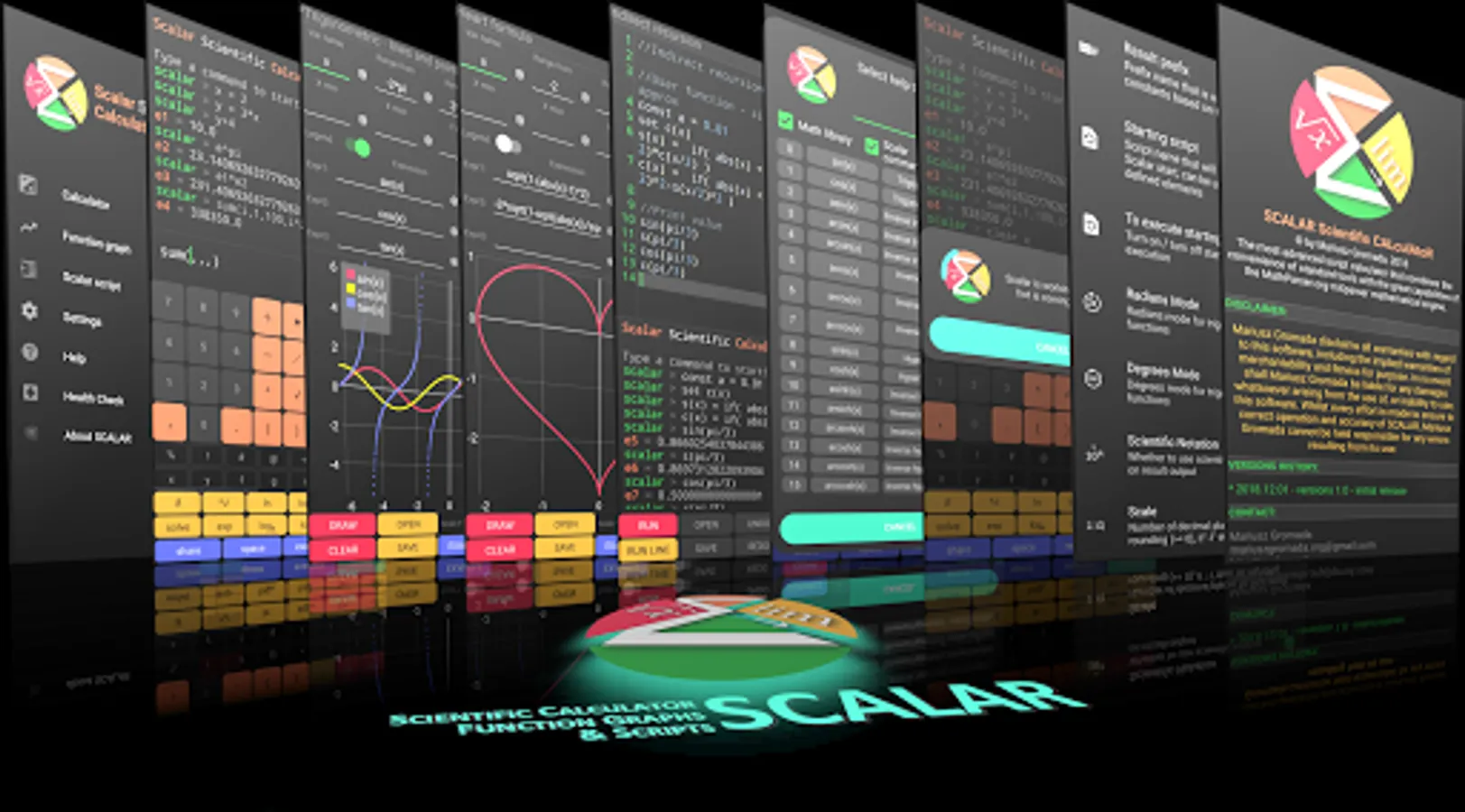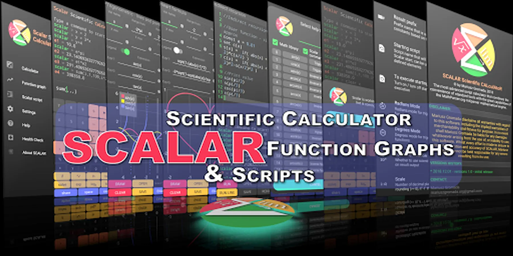 Scalar is much more than a calculator. Scalar is a powerful math engine and math scripting language, that combines the simplicity of standard calculators with the flexibility of scripting. Thanks to Scalar, defining arguments and functions, as well as using them in subsequent calculations, expressions and functions graphs, has never been easier. You will see it shortly after getting familiar with available screens and options.