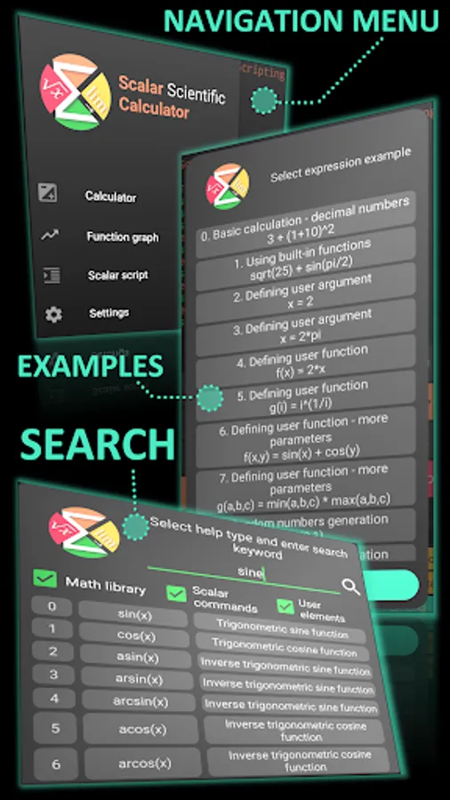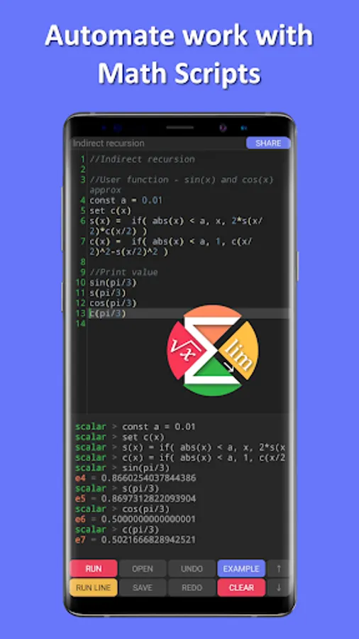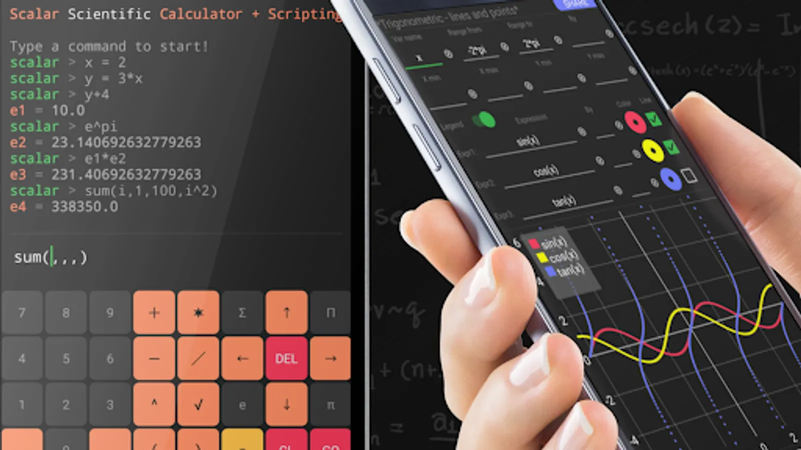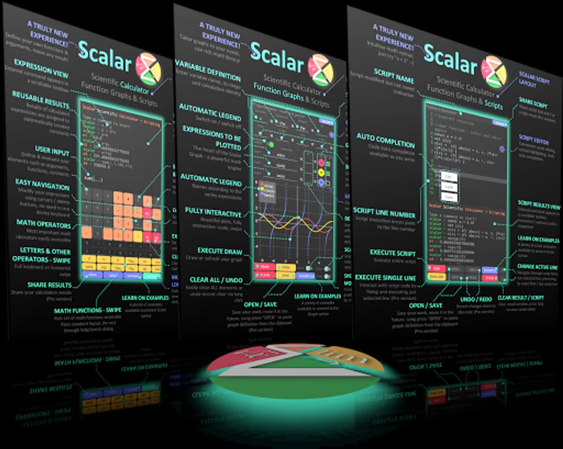 Scalar is much more than a calculator. Scalar is a powerful math engine and math scripting language, that combines the simplicity of standard calculators with the flexibility of scripting. Thanks to Scalar, defining arguments and functions, as well as using them in subsequent calculations, expressions and functions graphs, has never been easier. You will see it shortly after getting familiar with available screens and options.