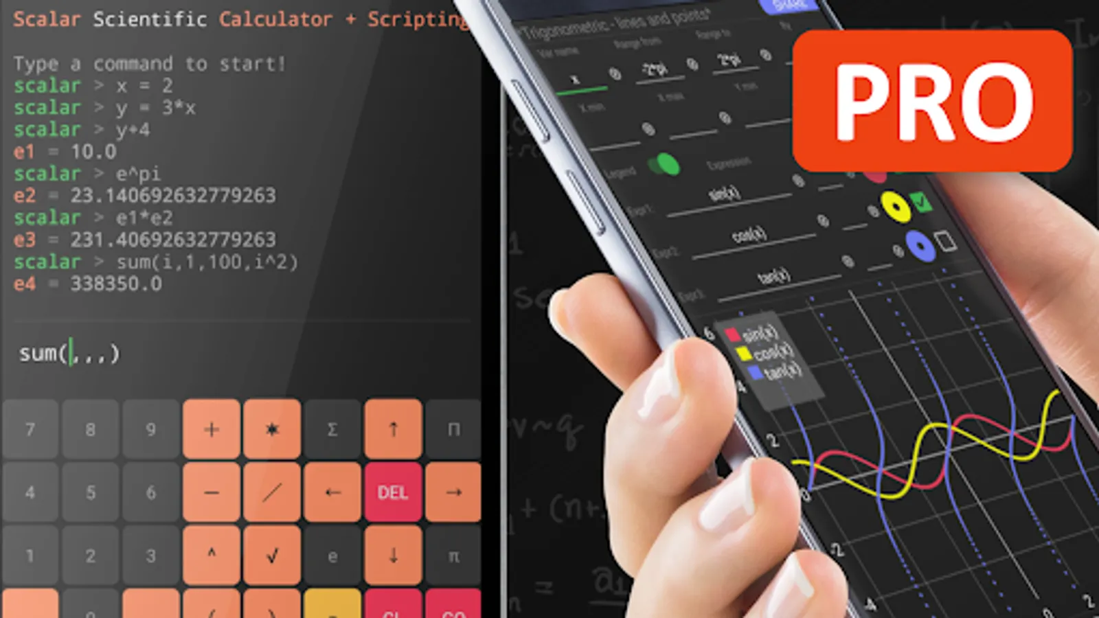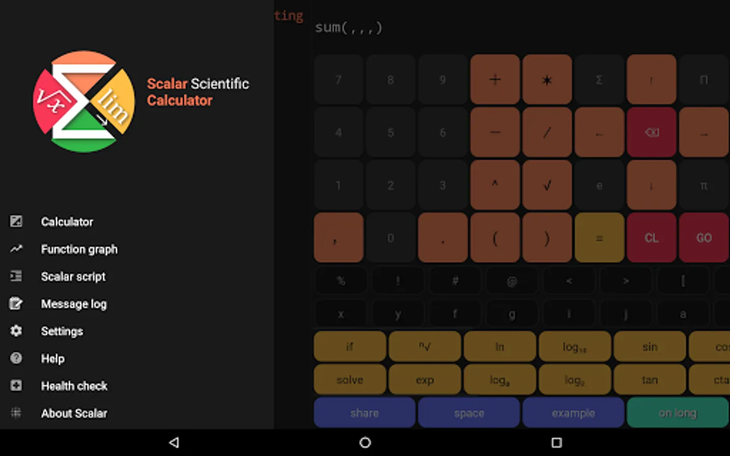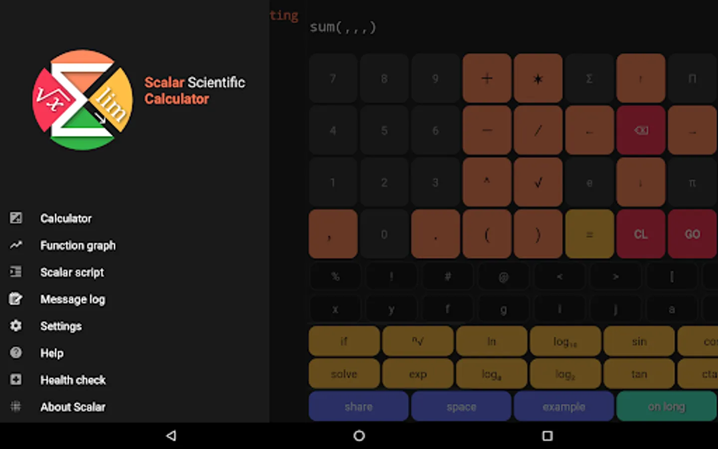 Scalar is much more than a calculator. Scalar is a powerful math engine and math scripting language, that combines the simplicity of standard calculators with the flexibility of scripting. Thanks to Scalar, defining arguments and functions, as well as using them in subsequent calculations, expressions and functions graphs, has never been easier. You will see it shortly after getting familiar with available screens and options.