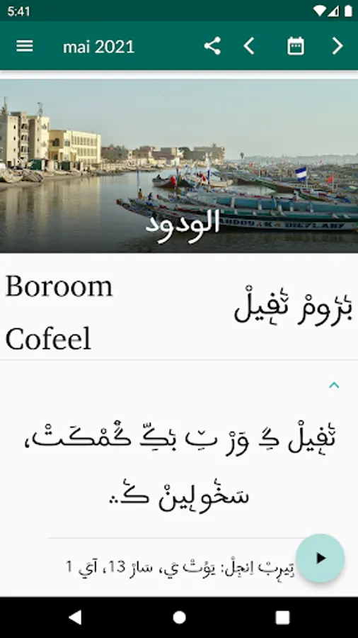 The Wolof calendar used in Senegal, its correspondence with the Western calendar day by day, all Muslim, Christian, and secular holidays, and verses from Tawreet, Sabóor and Injiil, on your mobile in a smooth and beautiful app.