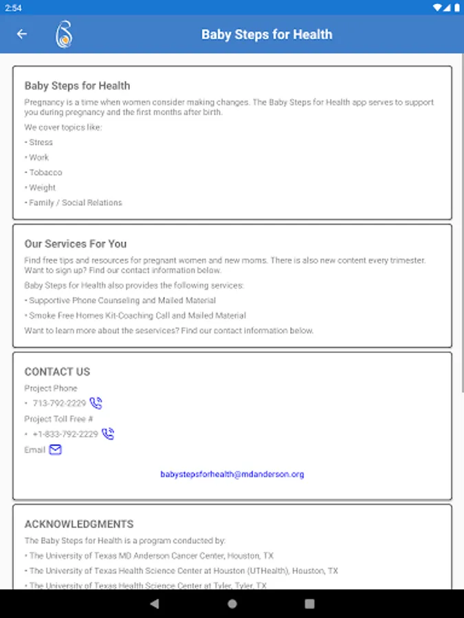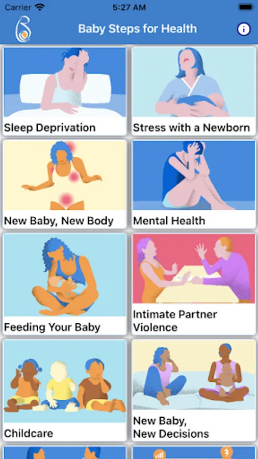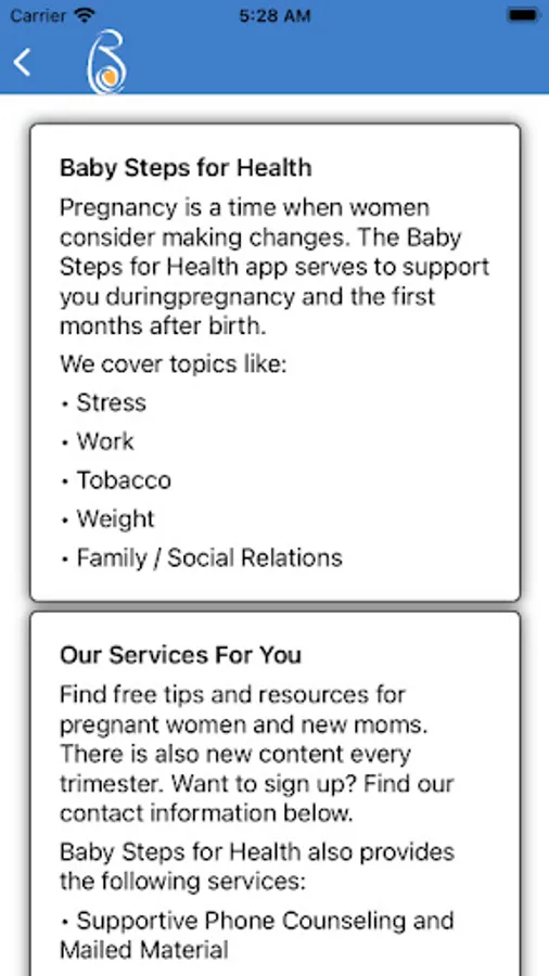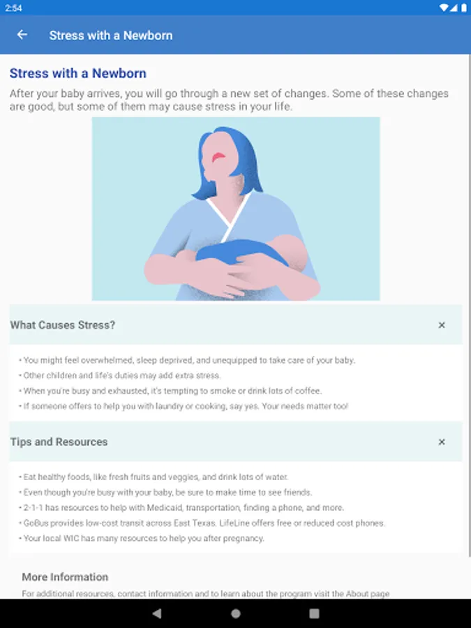 The Smartphone App covers wellness topics that are of special interest to pregnant women and mothers of newborns. These topics change with each stage of pregnancy and postpartum. You’ll find information, tips, and resources for dealing with issues like pregnancy side effects, stress, depression, sleep, work, smoking, weight, and tips to help with insurance, and transportation.
