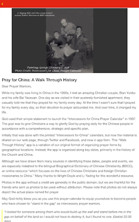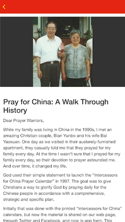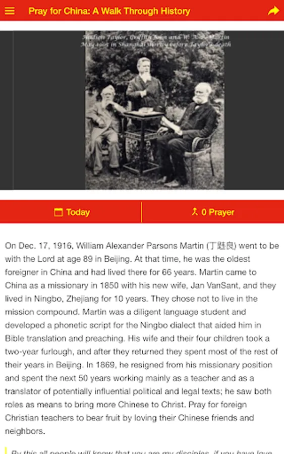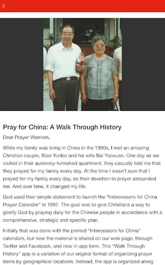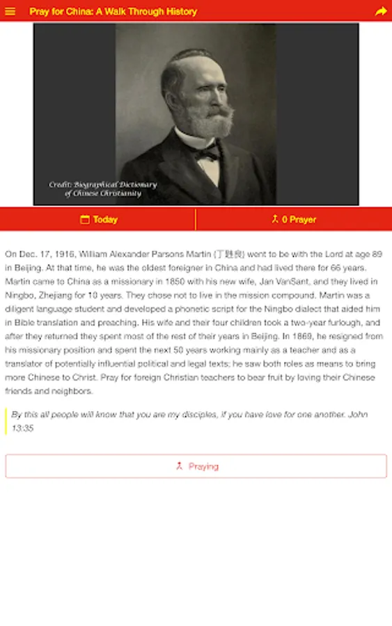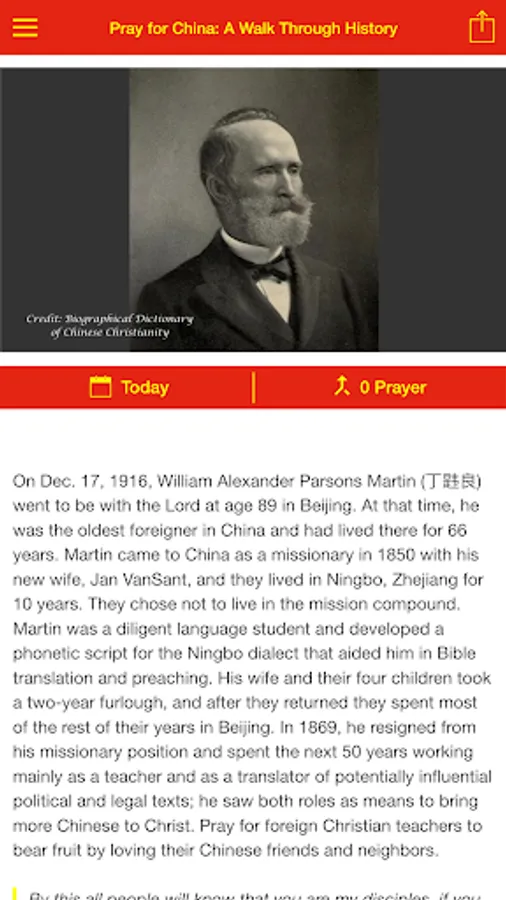 This “Pray for China: A Walk Through History” app was developed to give Christians a way to glorify God by praying daily for the people of China. We have placed most items on the specific day of an historical event, with most related to China or the Chinese Church. Each prayer request is followed by a Bible verse so that God’s Word will be the foundation for daily prayer. May God richly bless you as you use this prayer app to equip yourselves to become people who have chosen to "stand in the gap" as intercessory prayer warriors.