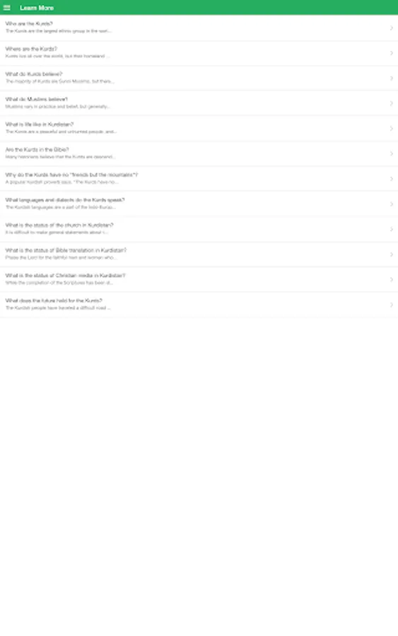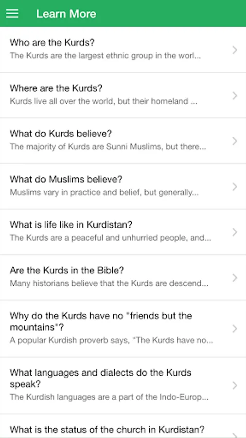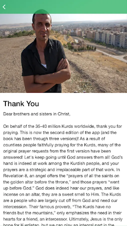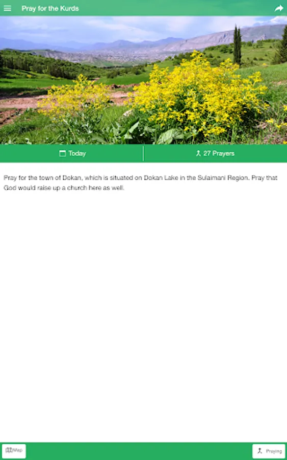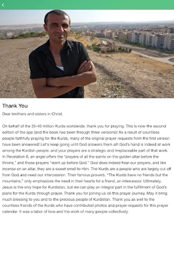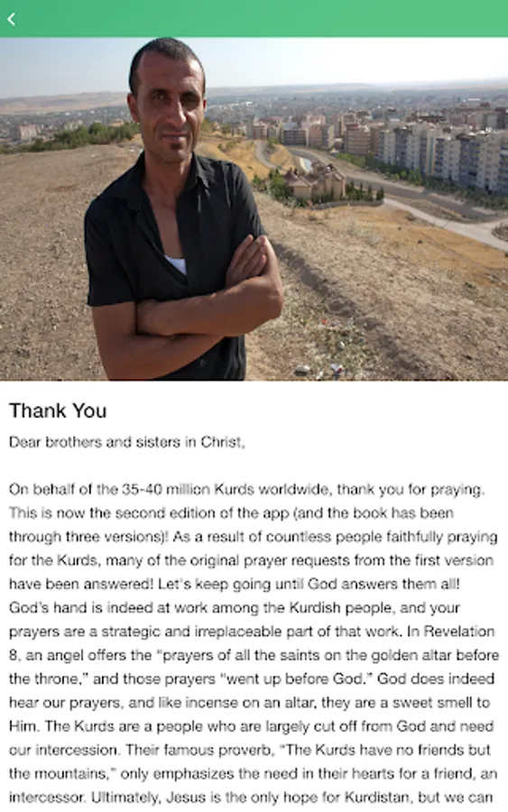 This daily prayer guide provides a rich opportunity for you to join believers around the world in prayer for the 35-40 million Kurds worldwide. Through the app, you will receive daily prayer requests and praise reports to use during your prayer time. You can see how many people who are praying alongside with you. You can learn more about the Kurds, and discover their rich culture. The app also provides a tool for you to set daily reminders to prompt you when to pray. This app was designed to help you to grow as a global believer, and pray for God to work among the Kurdish people group.