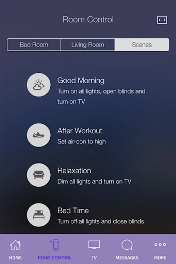 - Control room lights, temperature, curtains/blinds, mood scenes