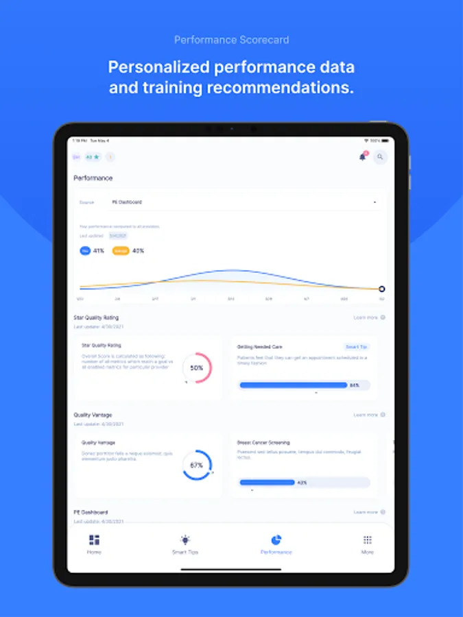 Your customized performance scorecard gives you instant access to key performance and quality metrics so you can see how well you’re doing against your individual goals and your peers. Plus, each metric is linked to a corresponding Smart Tip with recommendations to help you boost performance, save time and reach your goals. You can even create or join Teams, where you can share Smart Tips and training advice.