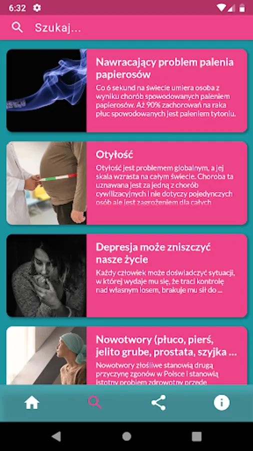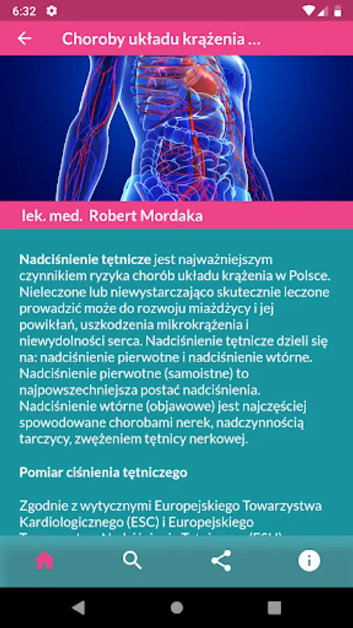 Thanks to this simple and functional application you will get information about the most common health problems, civilization diseases, which in the first phase are asymptomatic, about the consolidation of healthy healthy lifestyle patterns, disease prevention by controlling risk factors, secondary prevention, i.e. prevention of the consequences of the disease through its early detection and treatment and inhibiting disease progression and reducing complications by learning to control disease parameters.