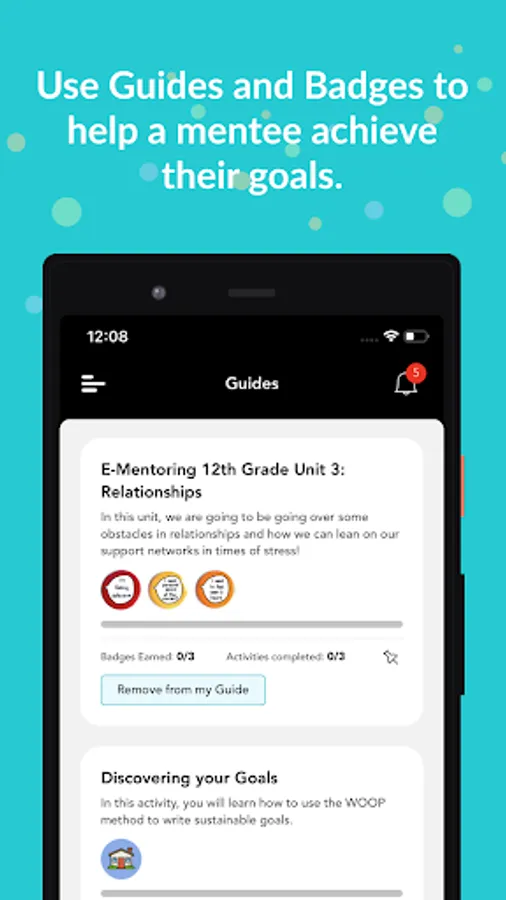 Students sign into MentorHub, complete the survey and mood ring, and then download the recommended app(s). Through MentorHub, third-party apps send students' usage data to their coaches or mentor. Mentor can assign a guide to a mentee. Mentee will be able to complete activities and achieve badges. Mentor and mentee can also assign goals.
