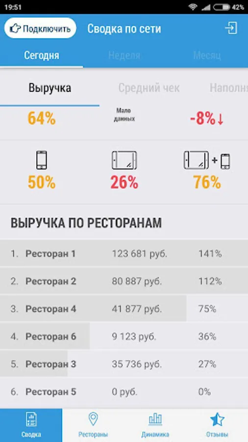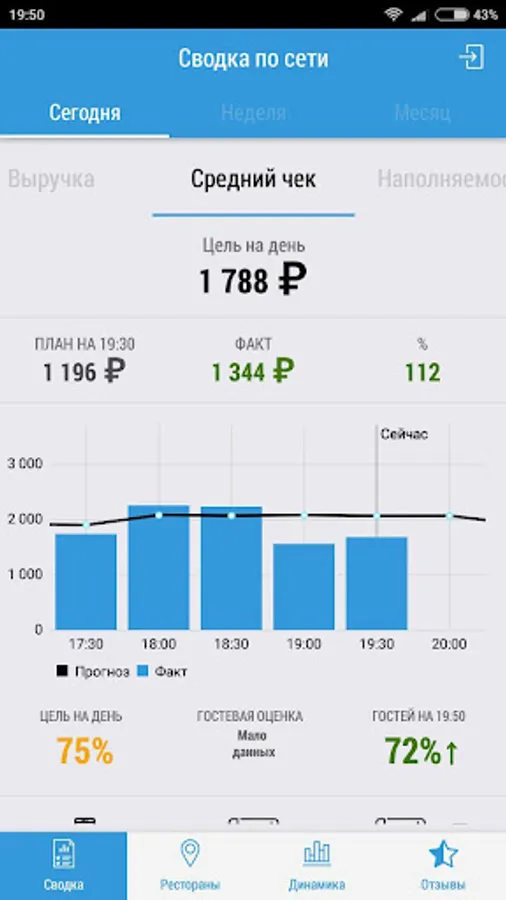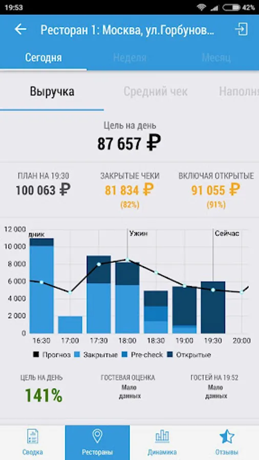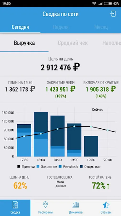 Terminal Director MENUFORYOU - a solution that makes it possible at any time and in the world, see the "Forecasts and Progress" to fulfill% of the sales plan for each restaurant and the overall progress of the network, find out what the sale will be in the near future, and also to write a message employee (waiter, manager), as well as see customer reviews (when using an electronic menu or loyalty systems).