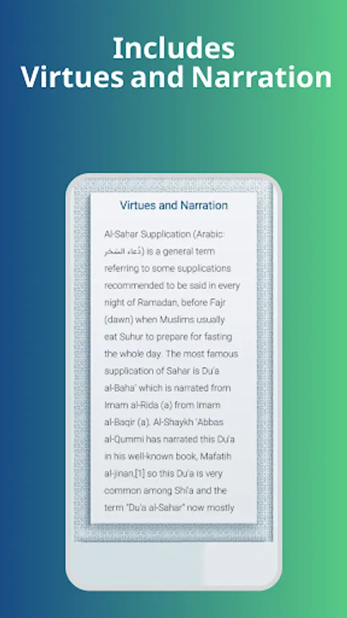 Al-Saḥar Supplication (Arabic: دُعاء السَحَر) is a general term referring to some supplications recommended to be said in every night of Ramadan, before Fajr (dawn) when Muslims usually eat Suhur to prepare for fasting the whole day. The most famous supplication of Sahar is Du'a al-Baha' which is narrated from Imam al-Rida (a) from Imam al-Baqir (a). Al-Shaykh 'Abbas al-Qummi has narrated this Du'a in his well-known book, Mafatih al-jinan,[1] so this Du'a is very common among Shi'a and the term "Du'a al-Sahar" now mostly refers to this supplication.