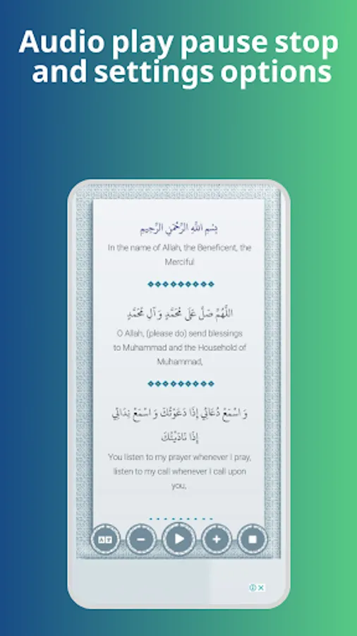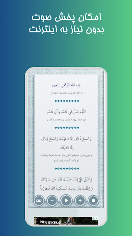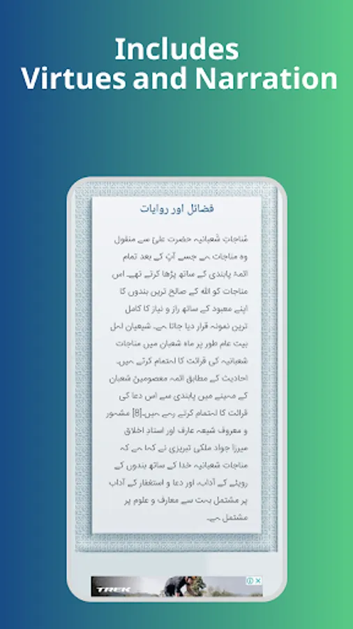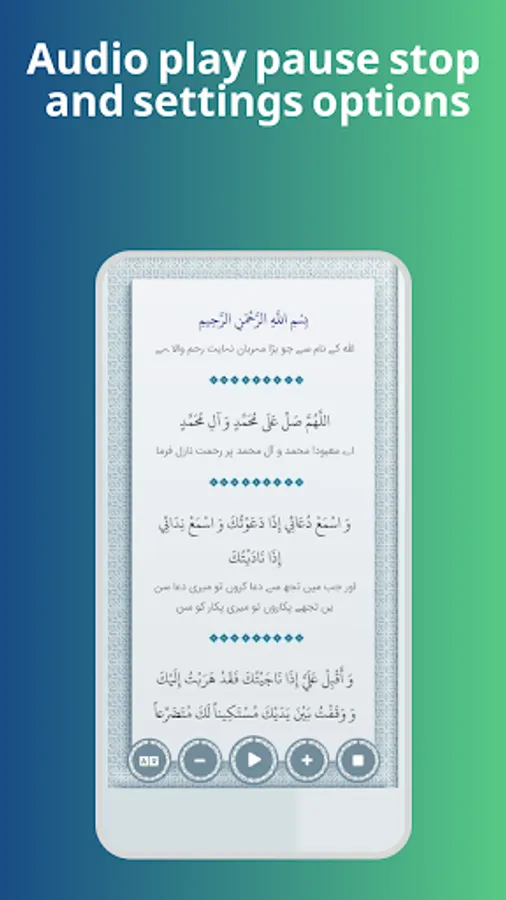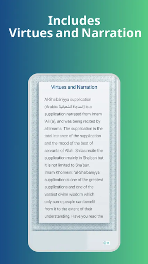 Software features : Astatic and beautiful interface, Audio play, pause, stop and settings options, English translation, Changing font size option, Language option (English, Urdo, Persian), Beautiful recitation, Text is highlighted as it is being read, Completely offline, No Internet, Virtues and Narrations of Al-Sha'baniyya Supplication