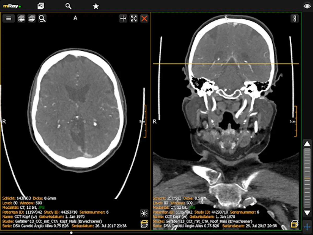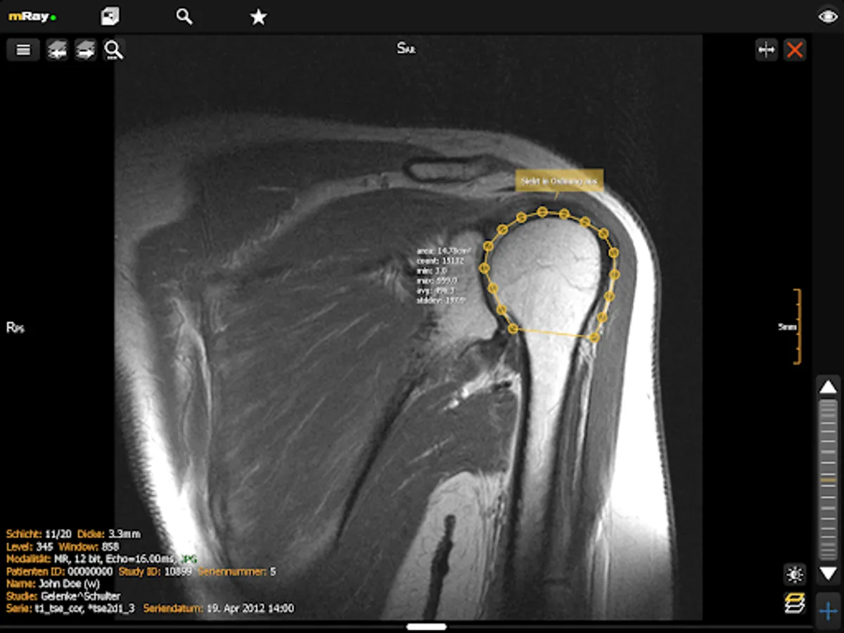 In contrast to other solutions, mRay is specifically designed for mobile devices. Important tools like annotations and measurements are available as well as an adaptable level window. Image data is encrypted and stored temporally locally on the device, removing the need of a permanent Internet or Wi-Fi connection while ensuring highest security standards. Most notably, mRay implements well-established security measures to protect your image data and privacy. An individual user and device authentication controls the image access of every user for every image.