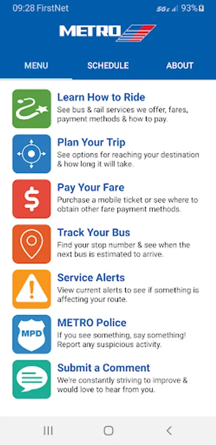 Using the RideMETRO app, you can learn how to ride bus and rail, with information about: