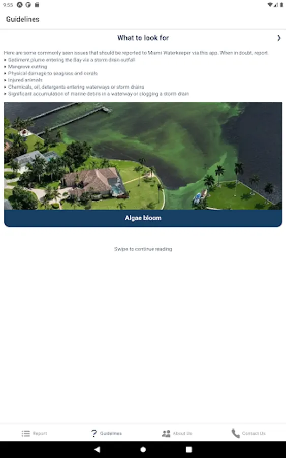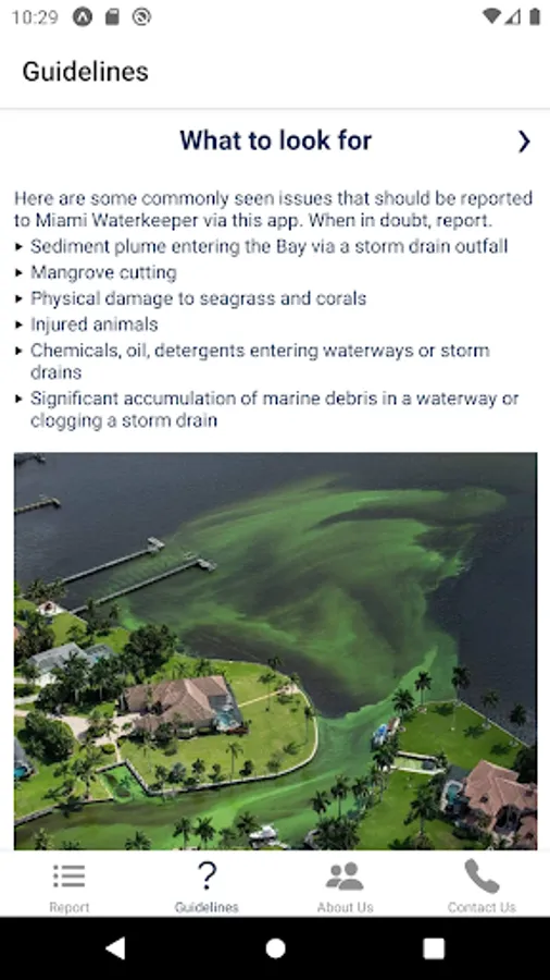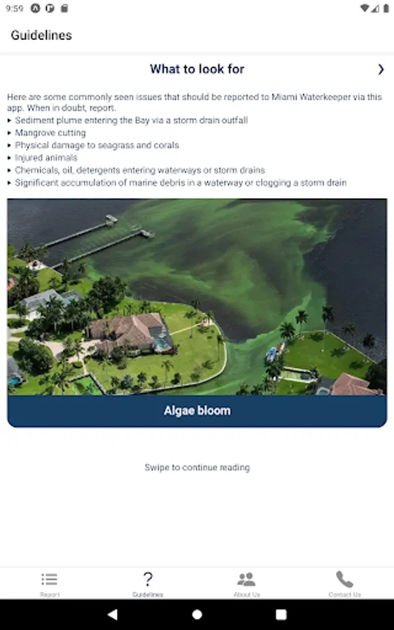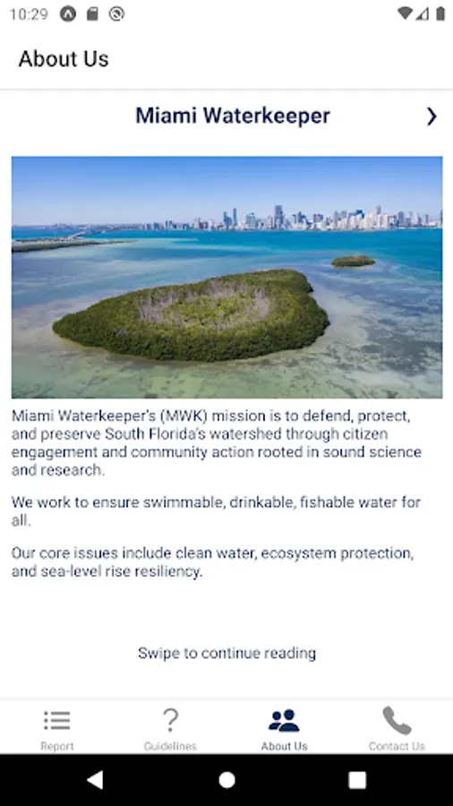 The Miami Waterkeeper Pollution Reporting App was designed to make it easy and fast to report pollution incidents you see in your community. Open the app, click report, and fill out a detailed form of the incident you have witnessed!