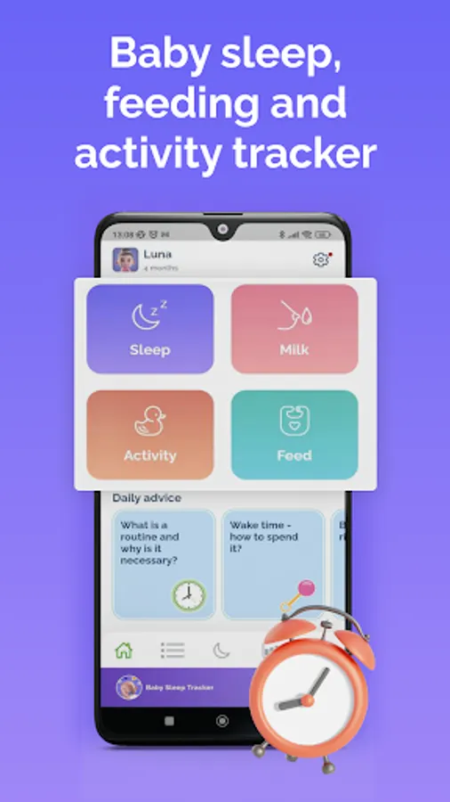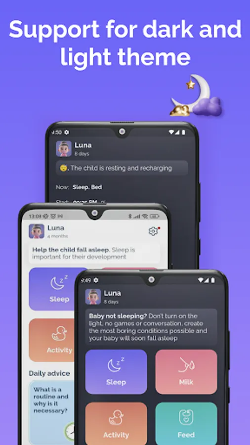 In the application, you can find a baby sleep tracker, breastfeeding tracker, feeding tracker, baby activity log, timers and notifications, dark and light themes, and a user-friendly interface without unnecessary functions.