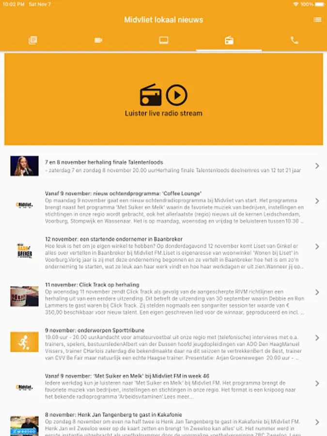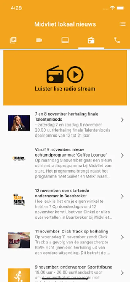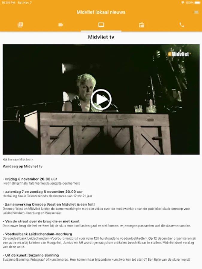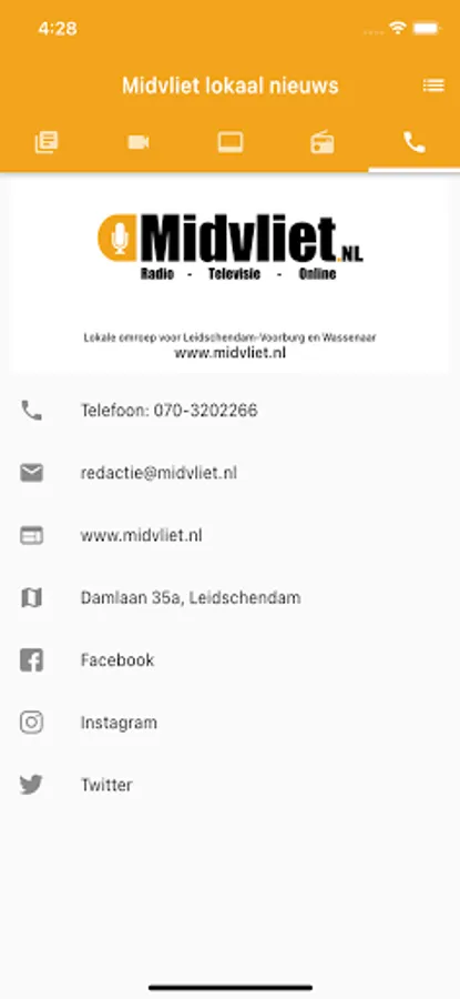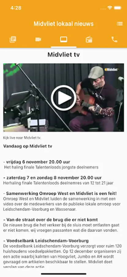 Midvliet is the local broadcaster for Leidschendam-Voorburg and Stompwijk. Midvliet can be received via radio, television and internet. This app makes it easy to read the local news from the region. A choice can be made between news from Leidschendam-Voorburg, the region or sports news. The on-demand TV items can be viewed. You can also watch live TV and listen to the live radio stream. The radio stream continues to play in the background without the app having to be active. The color of the app is adjusted if the user has set a dark theme in the Android settings.