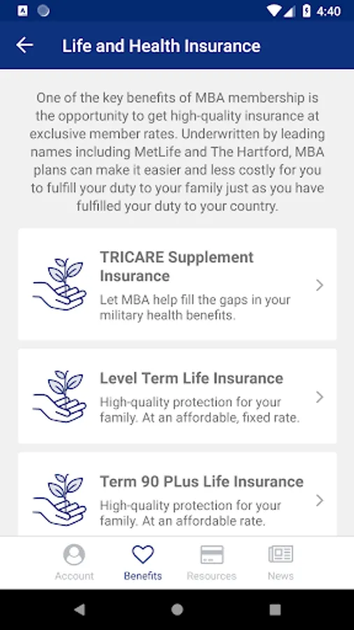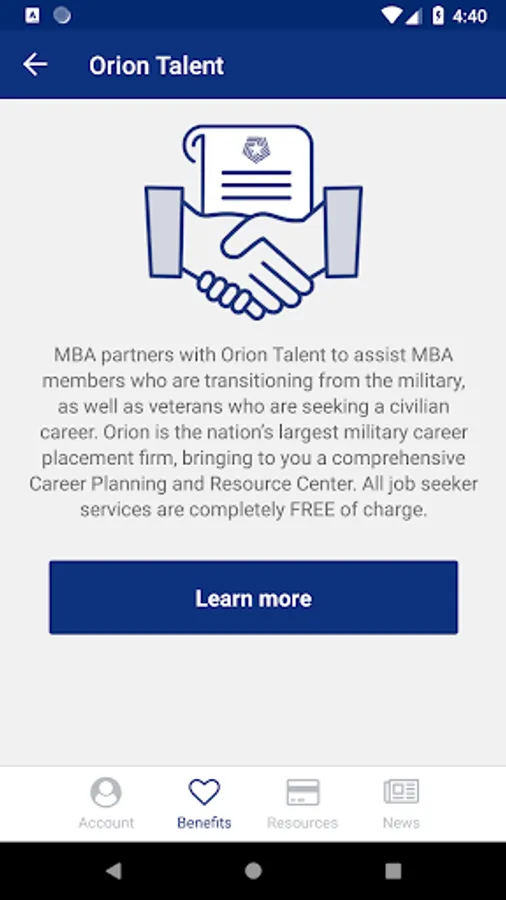Military Benefit Association (MBA) is a non-profit association created to safeguard and promote the economic welfare of current and former service members, federal employees, and their families. Use the MBA app to learn more about MBA and services we offer. Also use the app to access your account, MBA card and coverage.